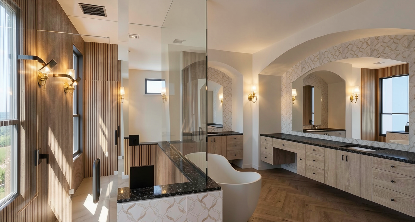 this is the second floor deck outside of the manager s office on the second floor of a large communal condo building the ceiling and floor should be in a reddish stained walnut plank with the walnut planks going front to back surrounding the property are spruce and pine trees with golden hour lighting