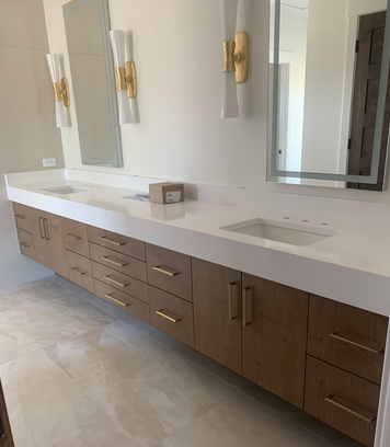 do not change the cabinets in any way preserve the exact cabinet colors materials finishes dimensions door and drawer styles hardware spacing alignment and all geometry exactly as shown do not alter the countertop shape backsplash appliances flooring lighting fixtures or wall structure only remove the construction materials clutter and mess from the scene clean the room and make it look finished and staged add a few simple tasteful home accessories appropriate for the style of the space but do not add or remove any furniture windows or architectural elements maintain the original lighting direction and realism enhance clarity and polish the photo while keeping the cabinetry and room design completely unchanged do not alter the lighting to keep the cabinet colors as they are add gold faucets to the sink turn the lights on stage for a luxurious master bath with gold accessories put a picture that complements the decor on the wall between the lights