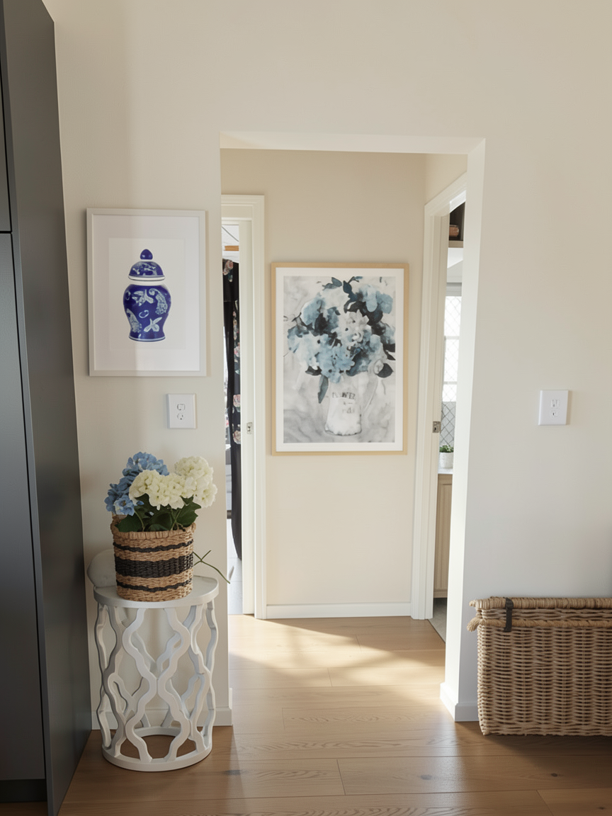 modernist interior shot a beautifully rendered modern apartment floor plan featuring a neutral color palette with light gray walls and soft white accents the living and dining area is cozy and inviting with warm beige tones for the flooring the bedrooms exude tranquility with muted pastel hues such as soft blue and sage green the kitchen is sleek and contemporary highlighted by stainless steel appliances and light wood cabinets bathrooms are elegant with marble like finishes and soothing seafoam green colors natural sunlight streams through large windows creating a bright and airy atmosphere throughout architecture