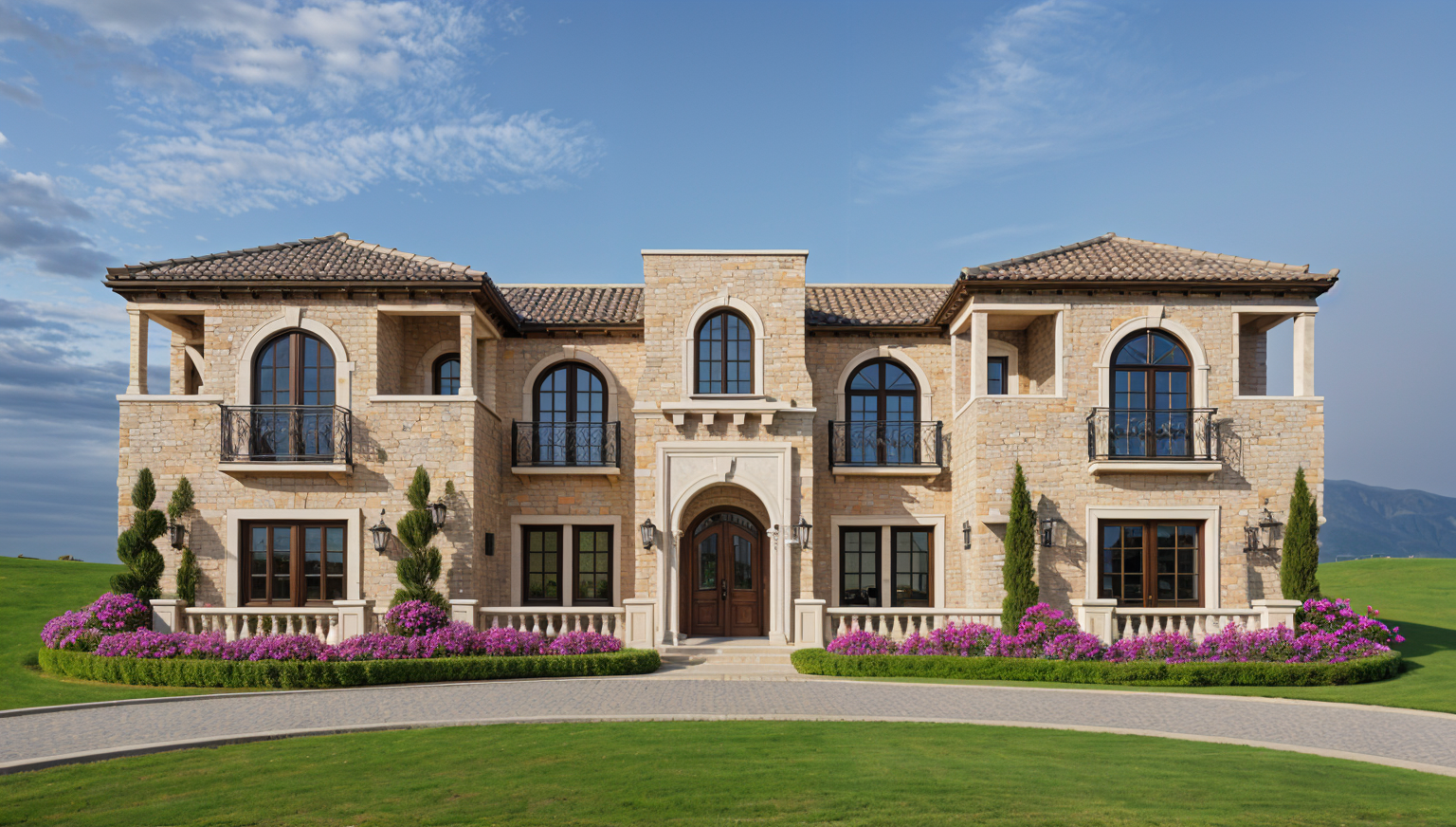 the roof is in gutter red color in the background there are small grass hills with few houses and few trees everything is in grass