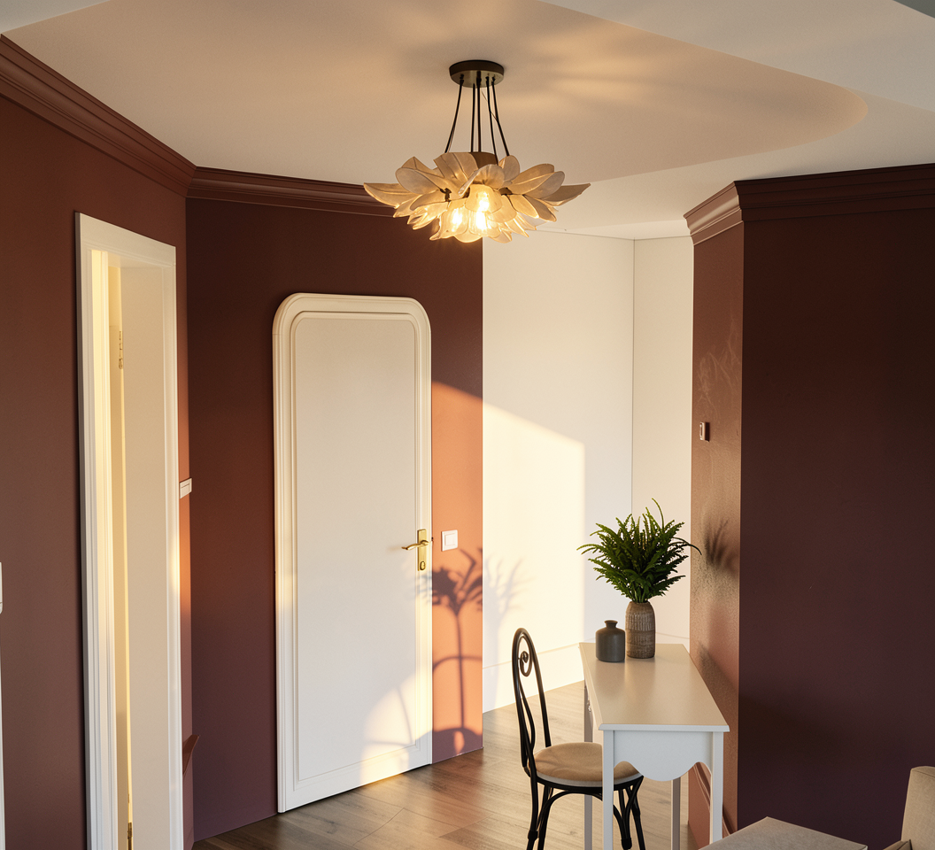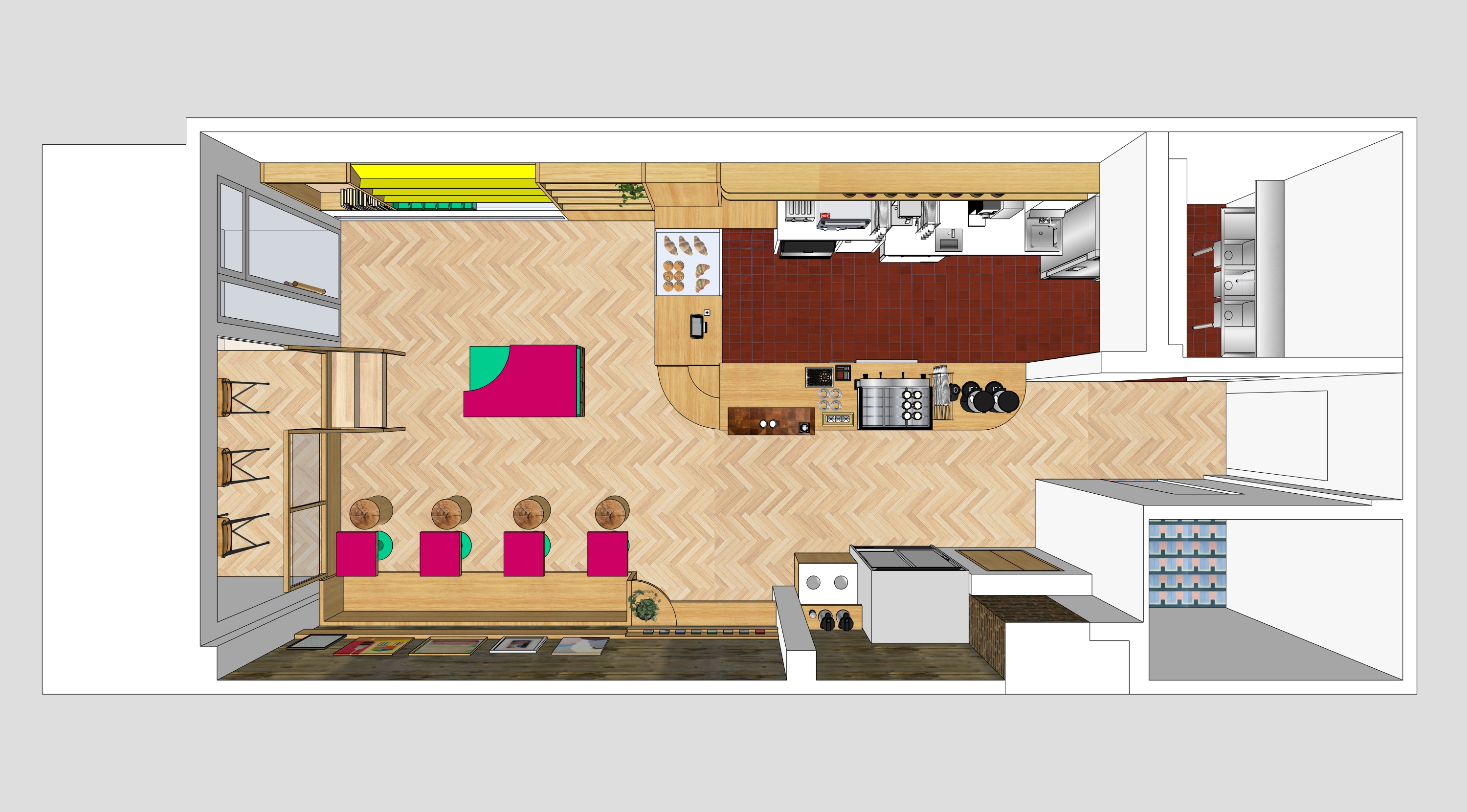 this is a birdseye or aerial view of an interior view of a coffee shop the furniture is oak and jade green powder coated metal the space has soft natural light in it do not change anything about the structure of the space the tabletops are a deep coral color laminate surface
