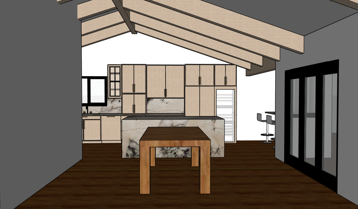 add upper cabinets over the window change the island and countertops to a lighter material add ambient warm lighting add open upper corner shelving add wine in display fridge light oak cabinets