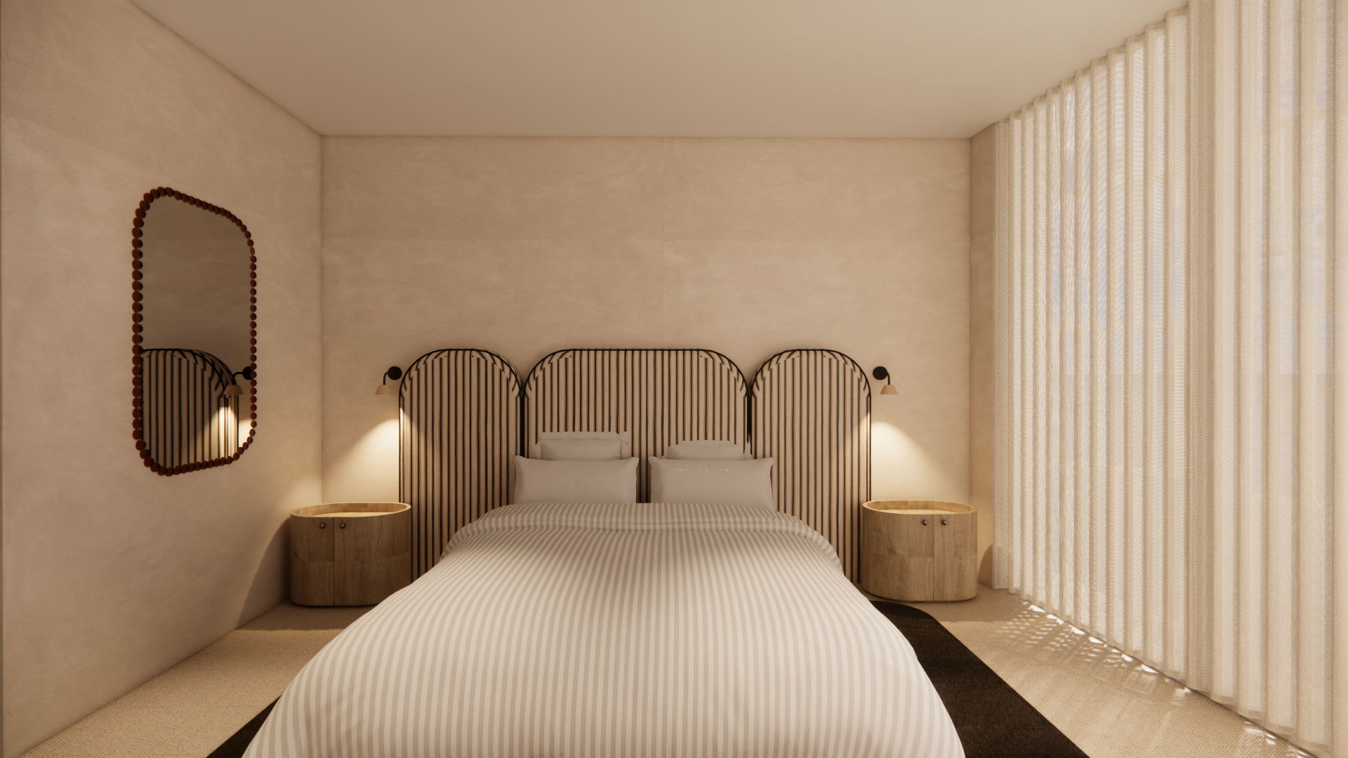 exterior shot replace current side tables with the burl side tables make drapery very soft and realistic make the outdoors an urban landscape