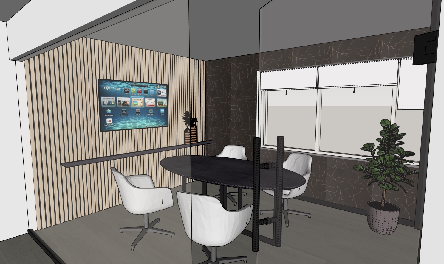create a high resolution photorealistic render of this interior maintain the exact composition camera angle architectural elements and furniture arrangement do not change any walls windows openings proportions or furniture placement enhance all materials and finishes for ultra realistic detail improve texture clarity shadow depth light reflections and surface realism add soft natural daylight streaming through the windows combined with subtle warm artificial ambient lighting to enhance depth and atmosphere maintain the original design while upgrading overall lighting contrast and material quality for a refined lifelike result
