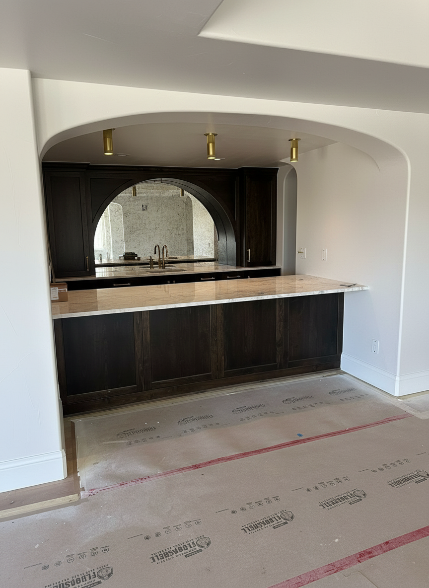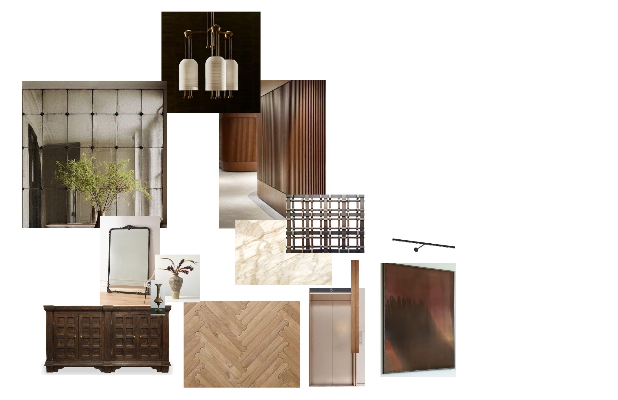 interior shot utilizing the sketch create an interior view of an elevator lobby using the sketch layout one elevator on the left hand side of the elevator lobby on the right hand side of the elevator lobby put three elevators the flooring is to be a wood pattern matching the mood board flooring image the flooring should be going down the hallway the back wall of the elevator lobby is antique gridded glass all other walls are to be a warm shade of white baseboards for all walls should be a warm wood and should following the sketch in terms of structure the front right wall will have a linear bar light to illuminate a piece of art the art work should take up 70 of the front right wall the artwork should be minimalist with some movement and a brown rusted color the ceiling lights of the elevator lobby will be a more modern fixture there will be three fixtures in total going down the elevator lobby on the ceiling the elevators are to have stainless steel doors the elevators should have a thin wooden frame around them that is a honey cherry color directly above each elevator is a rectangle of latticed bronze metal this bronze metal is sitting in front of a beige marble stone to the left hand side of the elevator lobby in between the elevator and the door is an antique wooden console the wooden console willl have elaborate paneling on the doors on top of the console will be a grey stone vase with dark purple flowers right next to that vase is a metal decorative vase filled with eucalyptus branches directly above the wooden console is an antique mirror with a decorative dark wooden frame at the ennd of the elevator lobby on the left hand side is a door the door is closed and directly across from the furthest elevator on the right hand side of the elevator lobby