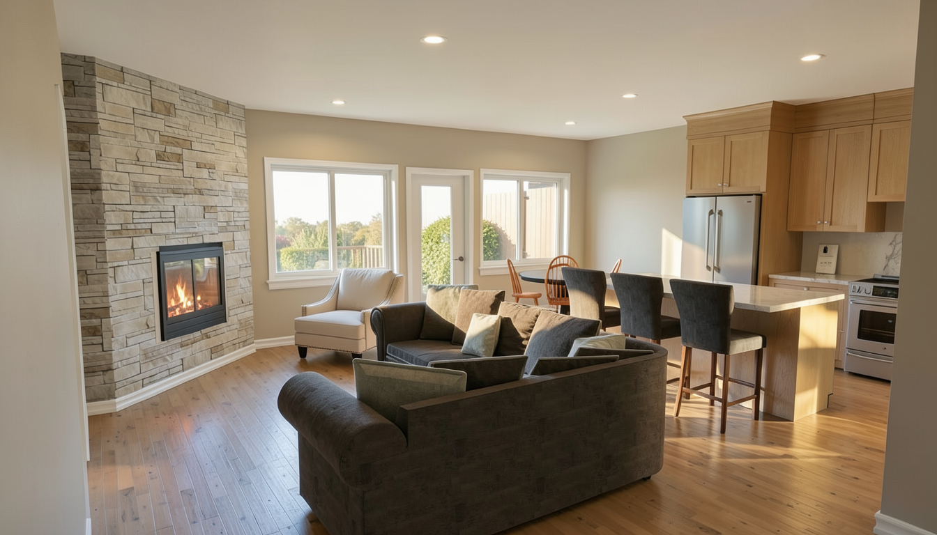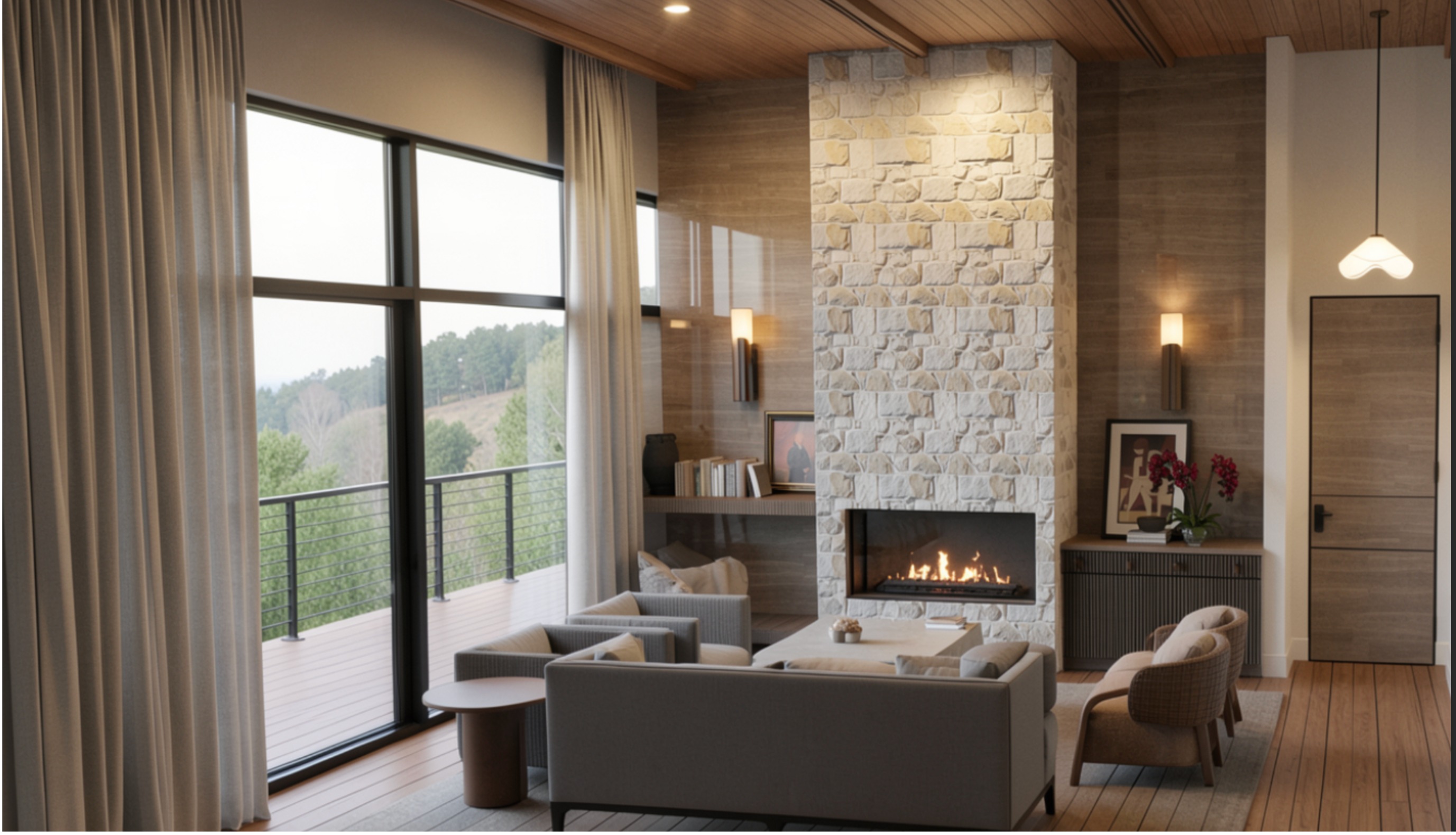 fireplace stone adjust the fireplace to a mountain overgrout stone finish stone should feel more irregular and organic with slightly varied block sizes and deeper grout lines use a warm light limestone tone with an overgrouted mortar joint for a rustic mountain modern texture flooring replace the flooring with light white oak wide plank flooring planks should be wide approximately 7 9 inches with natural white oak grain finish should be matte or natural oil with a light scandinavian tone soft beige with very subtle warmth ceiling wood tone keep the same ceiling wood material and grain but shift the stain tone from slightly orange to a deeper neutral brown the wood should read as a warm brown walnut like tone reducing orange undertones while maintaining warmth and richness do not change the plank size direction or ceiling design