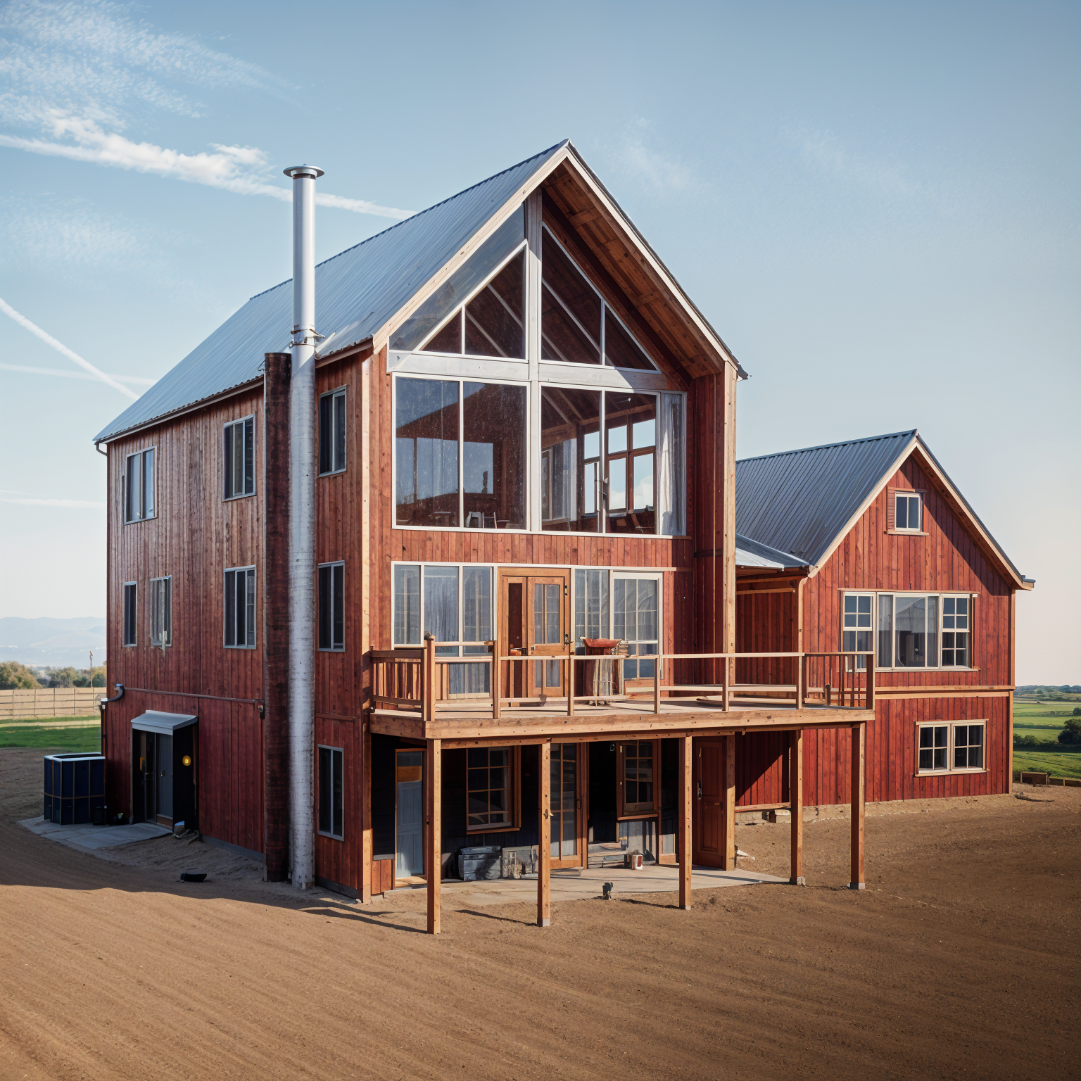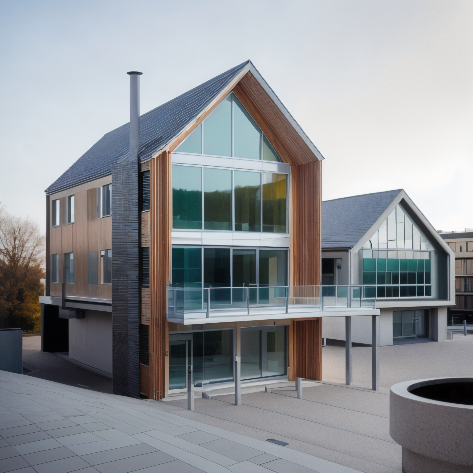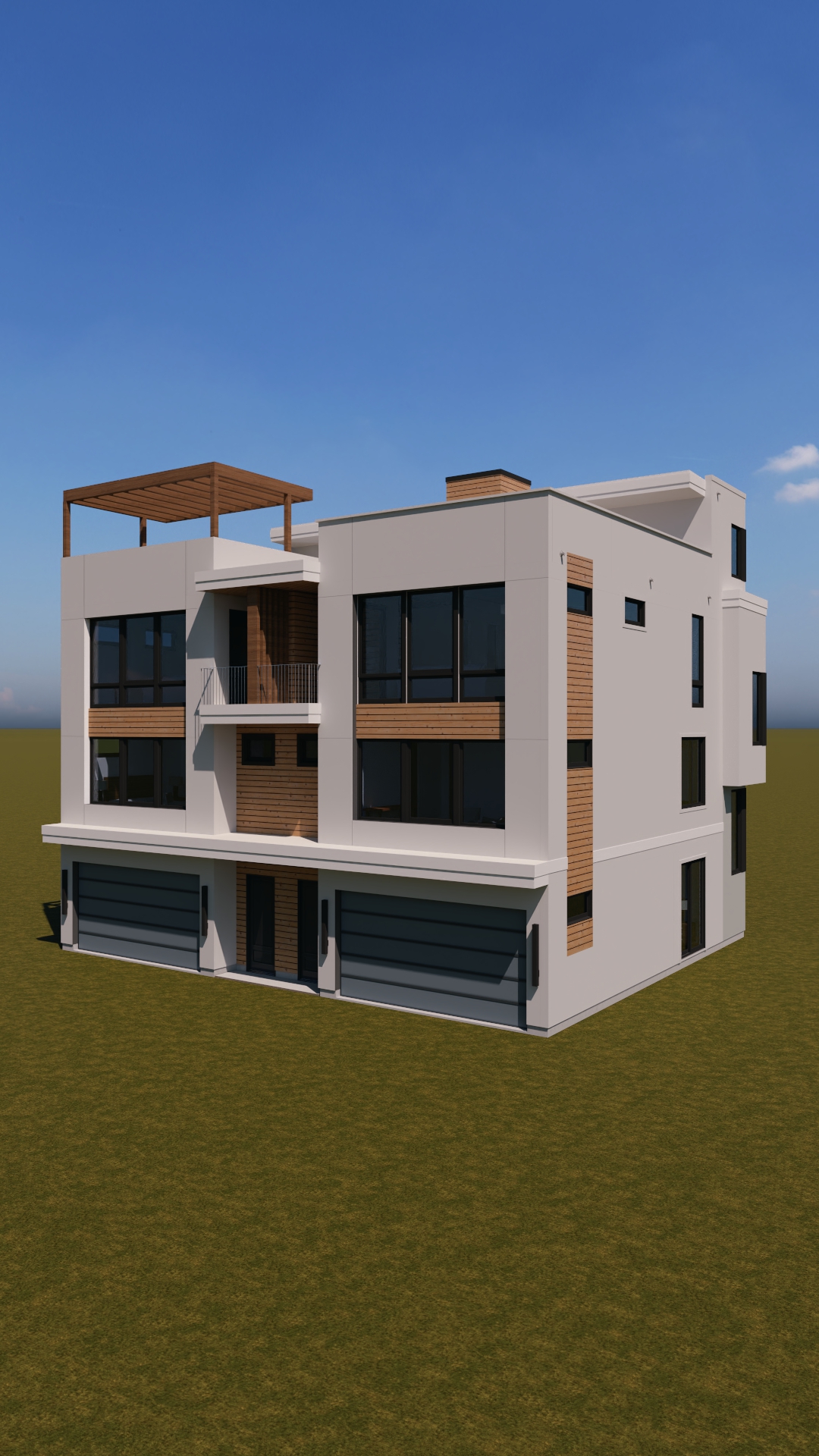 a modern three story building with a minimalist design featuring smooth white exterior walls complemented by light wooden accents the windows are large and tinted dark gray for a sleek look the garage doors are a deep charcoal color the balcony and rooftop pergola use warm toned wood enhancing the contemporary feel the atmosphere is bright and airy with a clear blue sky and soft natural lighting the surrounding ground is grassy green adding a natural contrast to the modern structure