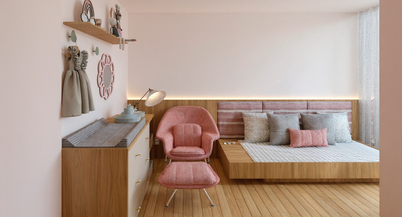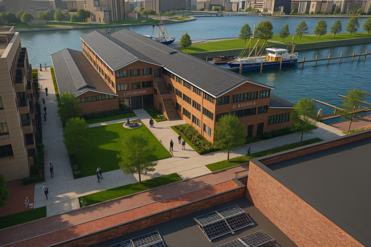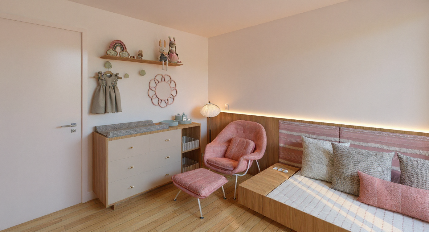 a modern three story building with a minimalist design featuring smooth white exterior walls complemented by light wooden accents the windows are large and tinted dark gray for a sleek look the garage doors are a deep charcoal color the balcony and rooftop pergola use warm toned wood enhancing the contemporary feel the atmosphere is bright and airy with a clear blue sky and soft natural lighting the surrounding ground is grassy green adding a natural contrast to the modern structure