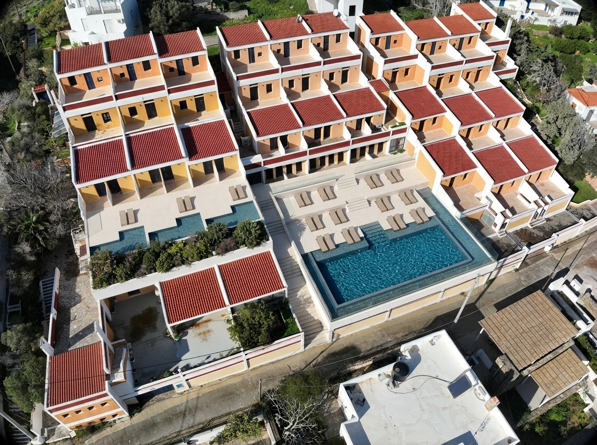 aerial view of a luxurious hillside villa complex with a harmonious mediterranean style highlight the warm terracotta roof tiles in a rich rusty red hue use a combination of soft peachy beige for the walls contrasting with creamy white accents for an elegant look include multiple inviting pools with sparkling azure blue water that reflects the golden sunlight the surrounding lush verdant greenery should evoke a serene tranquil atmosphere set against a clear bright sky with soft light for an inviting and relaxed ambiance