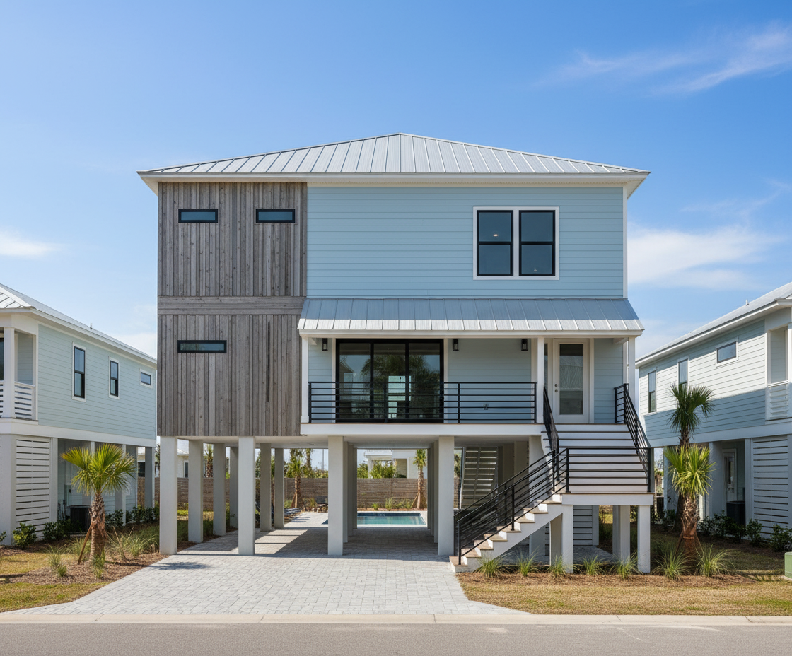 dark gray 1 3 4 standing seam metal roof white soffit and fascia white window frames light gray stucco walls with thin stucco control joints white flat panel garage doors each side of home at same setback as entry white solid panel entry door with side lights and transom window light gray stone on walls tropical landscape grass yard large light gray dappled paver drive and walk to entry blue sky with clouds