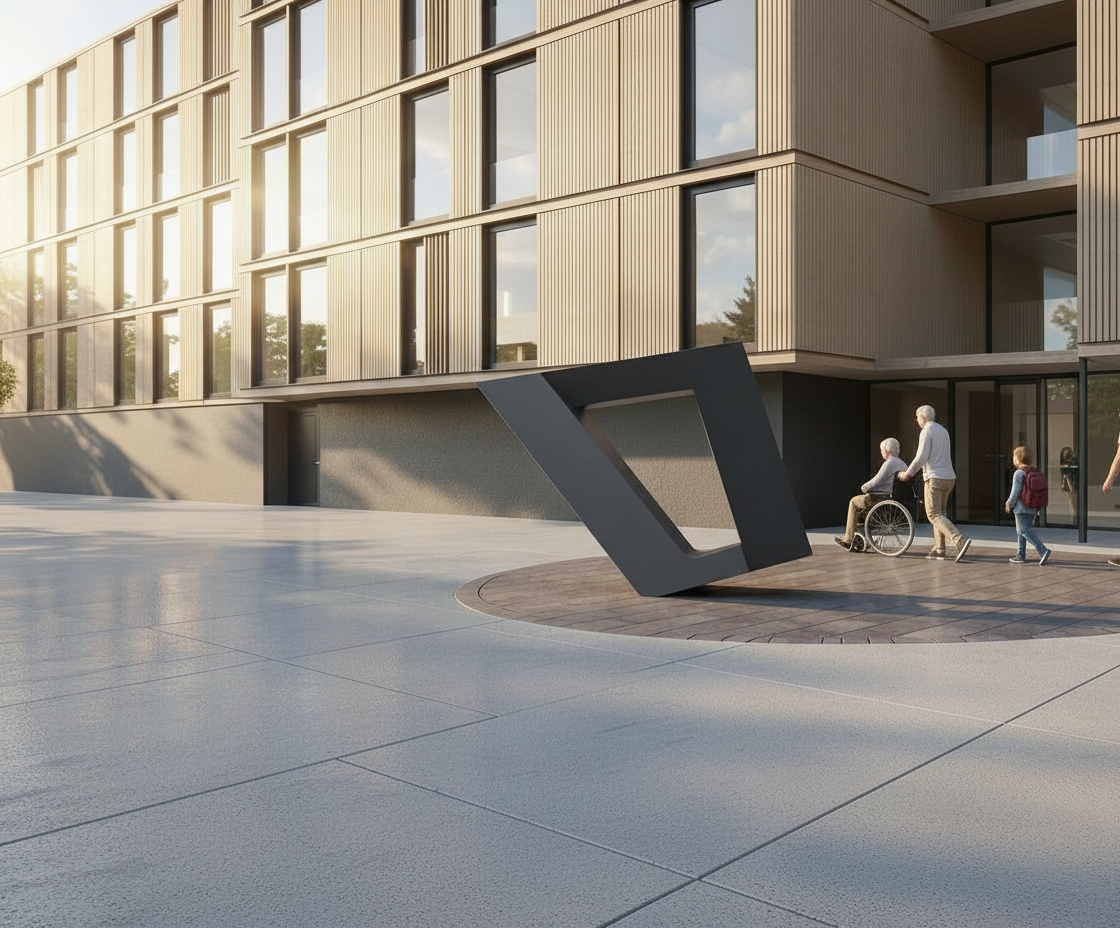 please add some windows in the ground floor dark grey wall and some landscape architecture in fron of the building mainly higher grass plants the rest should remain as it is