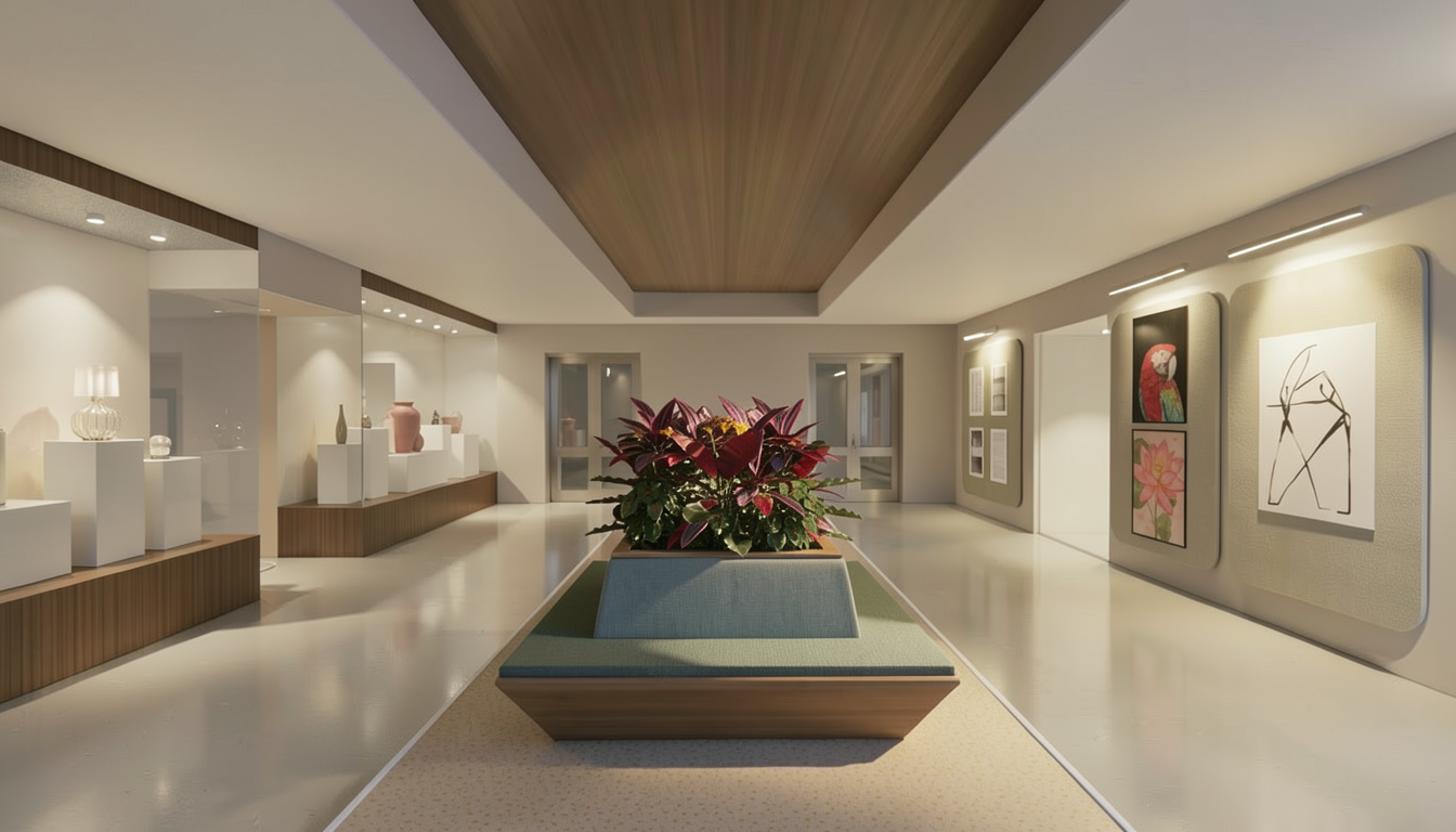 a dark immersive stage environment with an oversized suspended led screens add business people in smart casual work clothing in the audience