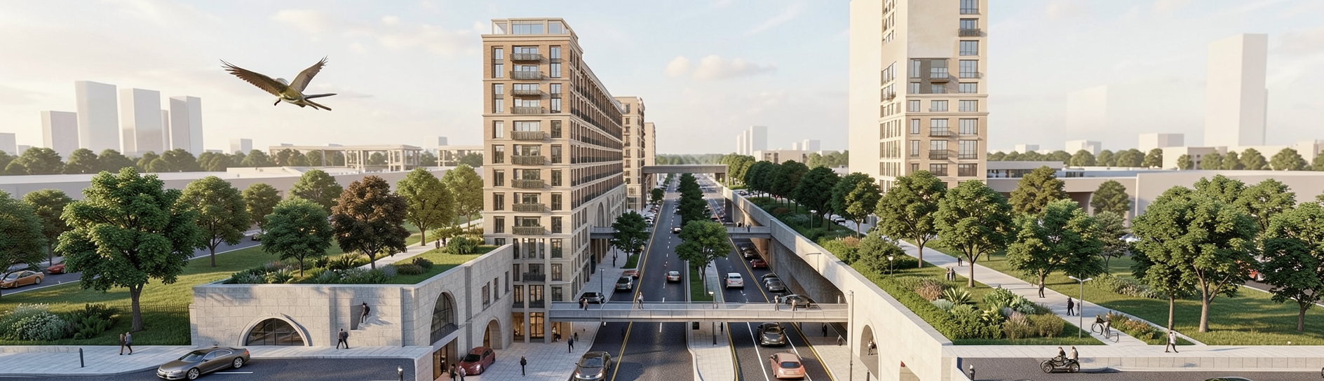 use this section to create a 3d axon view that shows the linear park on top with sidewalks 1 lane of traffic and 1 street parking along the boulevard and show the subway entrance from grade and from the top in the linear park the linear park goes along the boulevard and the building tower over it there are no building not he boulevard its goes straight back underground overhead walks ways included the linear park goes down the middle of the road and the buildings are towering over it