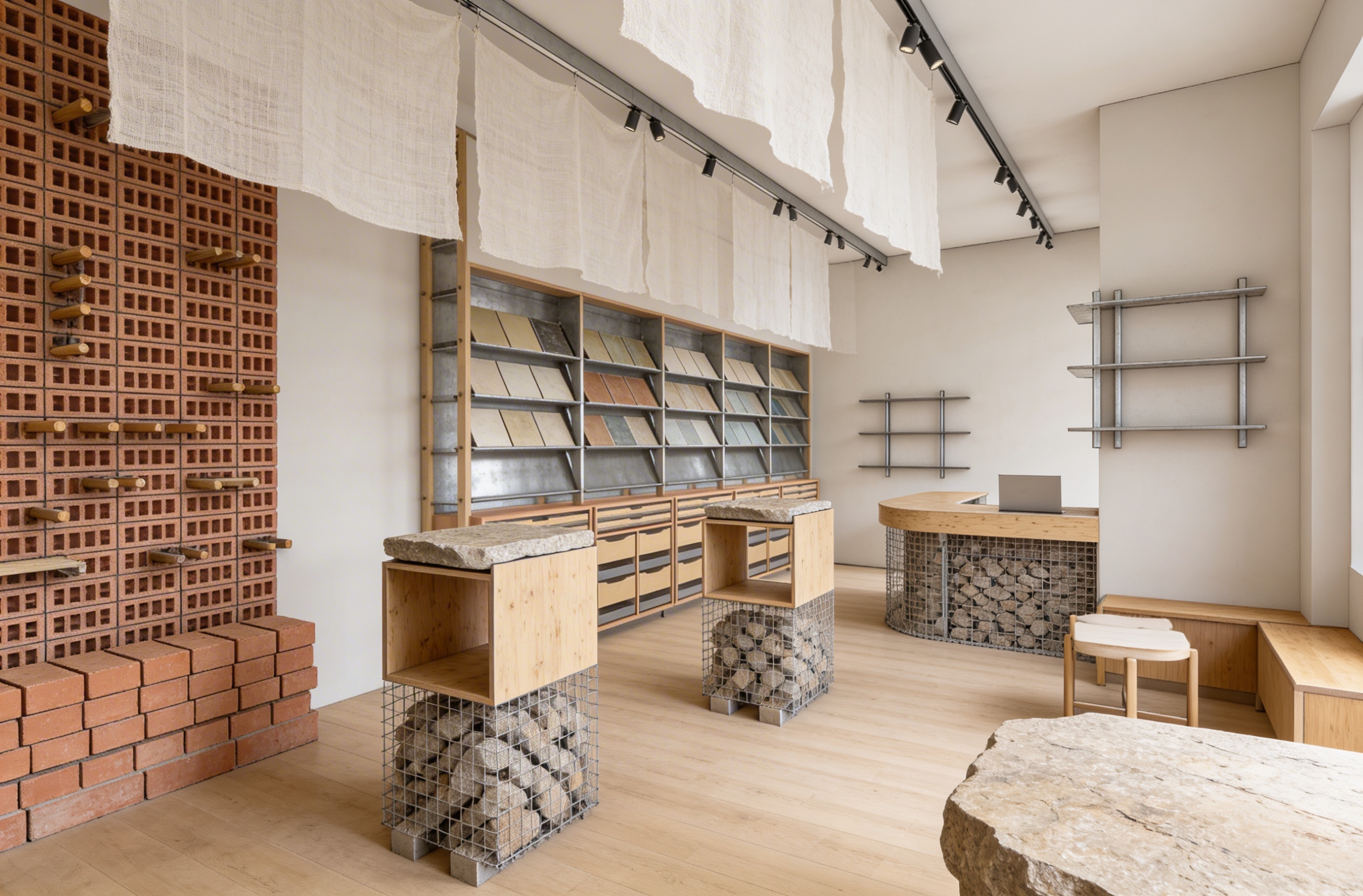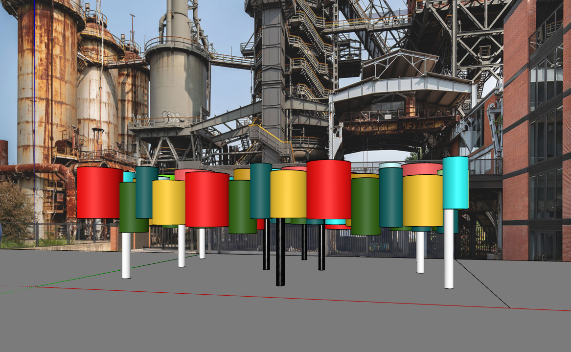 instalacion urbana en una zona industrial los tubos de colores son met licos y algunos tienen luz interior que ilumina el suelo con conos de colores vista al atardecer