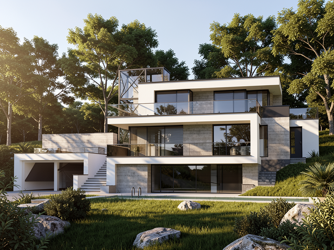preserve exact and same geometry same colours textures sun and shades position medium high trees in backround grass rocks bushes add car in front of garage