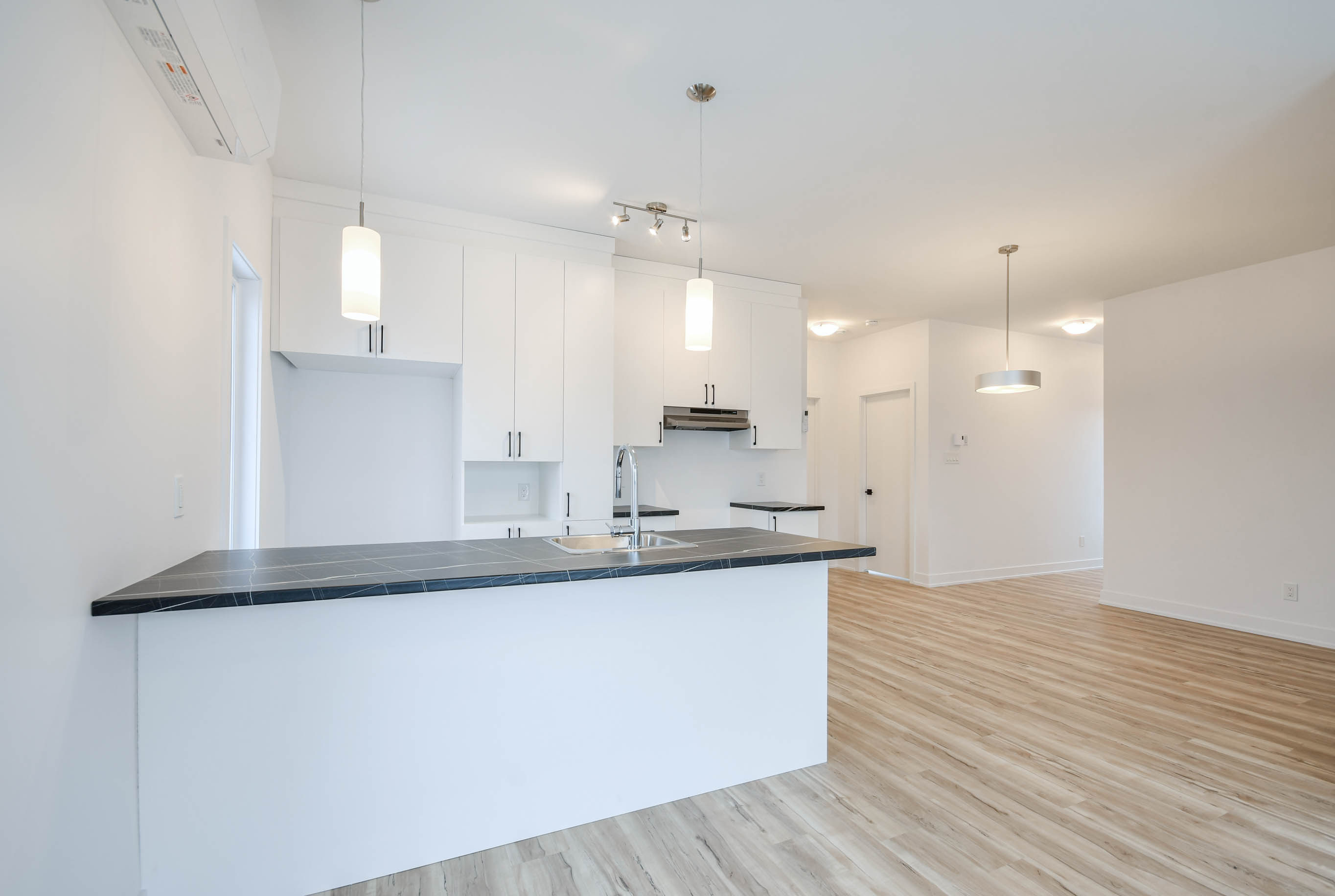 interior design of a modern scandinavian kitchen and dinning room photorealistic architectural rendering neutral color palette beige white light grey soft natural lighting sunlight streaming through windows add appliances furniture cream linen round table counter stools oak cotextured area rug indoor green plants abstract minimalist wall art high resolution 8k unreal engine 5 render cozy atmosphere decluttered inviting space