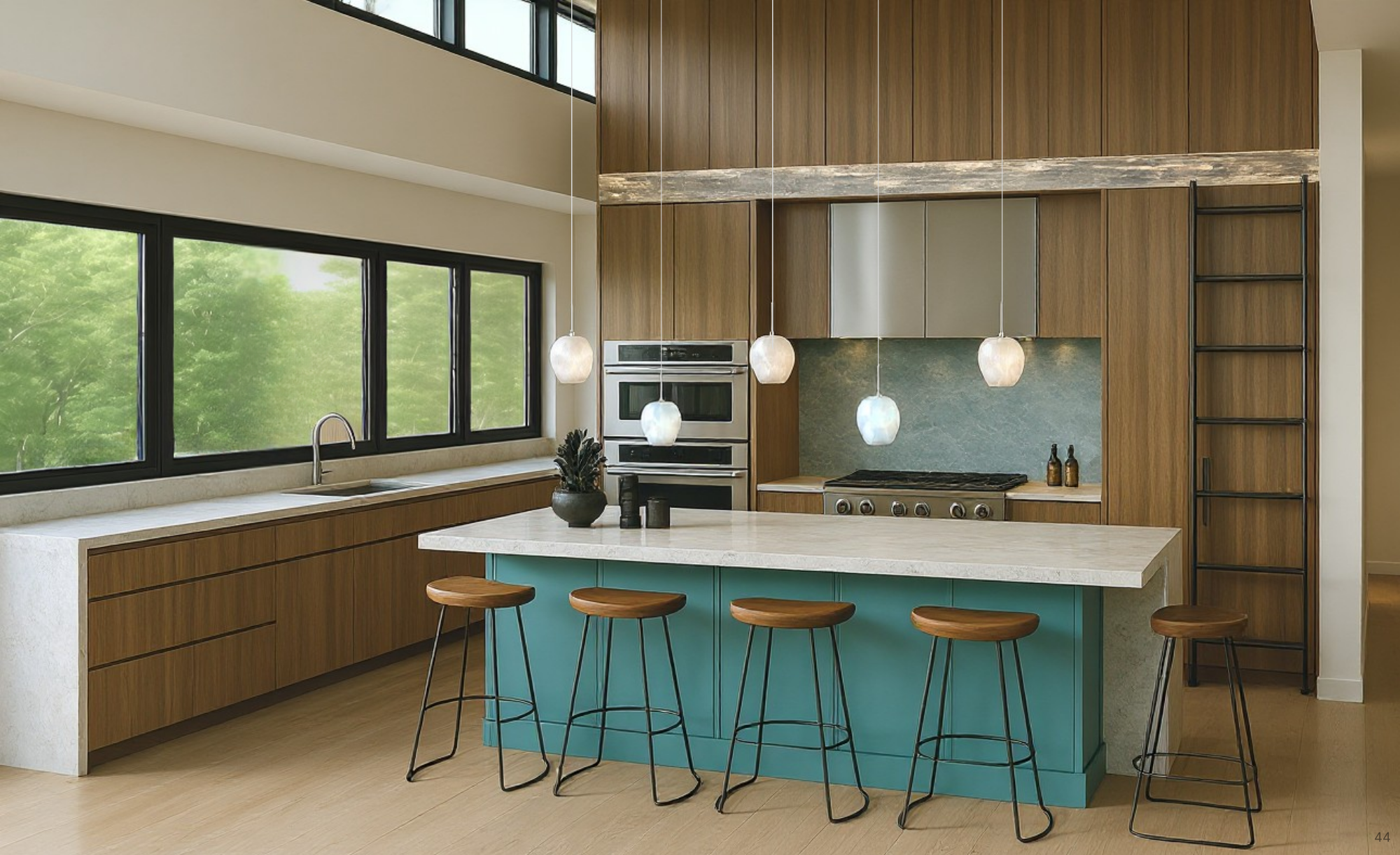 make the pendant lights a bit higher make the wood a slightly lighter tone keep the design the exact same keep colours the same make it photo realistic