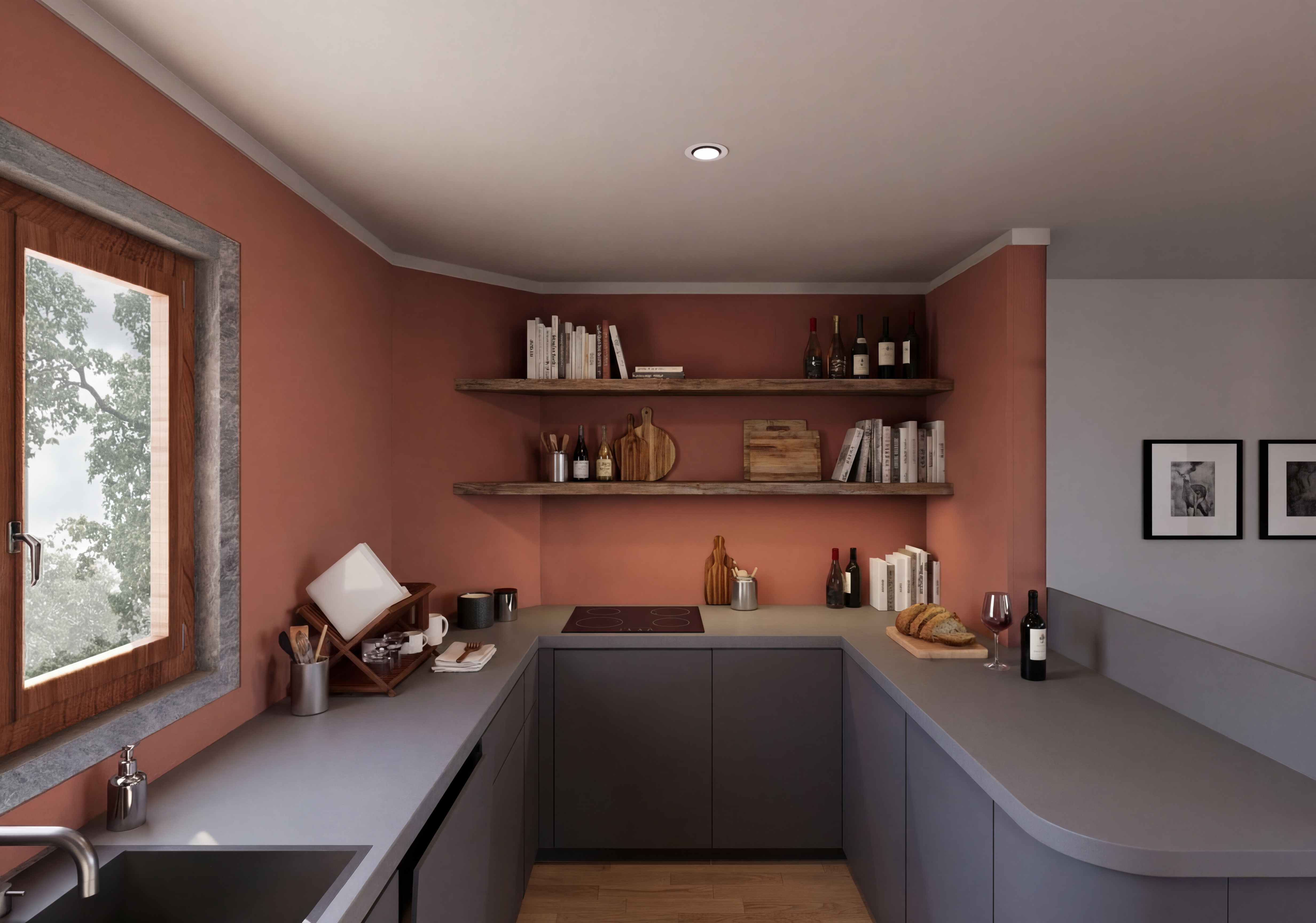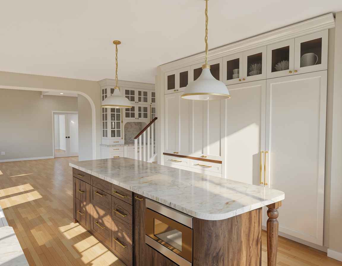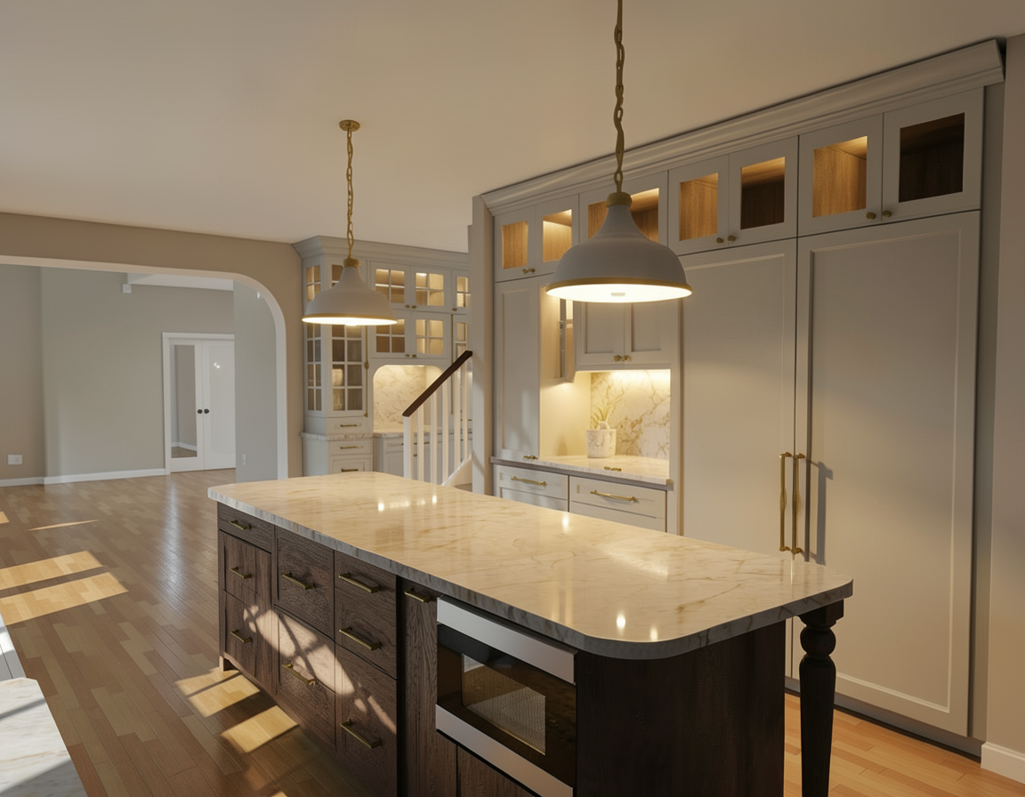 ultra photorealistic architectural rendering in a cinematic real time visualization style unreal engine d5 render quality late morning daylight with slightly angled sun creating soft defined shadows balanced exposure with no blown highlights low bloom and controlled dynamic range warm neutral color grading with subtle warm highlights and neutral shadows no blue tint natural material response with warm light reflecting off wood and ground surfaces slight contrast boost with clean crisp edges and subtle ambient occlusion clear atmosphere with no fog or haze but natural depth created through slight background softening and contrast falloff foreground and main subject remain sharp and detailed minimal curated landscaping with natural but slightly desaturated greenery no overgrown vegetation cinematic composition realistic sky with soft blue tones and light clouds professional architectural visualization style sharp focus 8k resolution lit and fully furnished interiors behind windows warm lighting detailed road with driveways to garages in foreground building on top of hill looking over view of city of cincinnati ohio in the background brick apartment on the left side of the building
