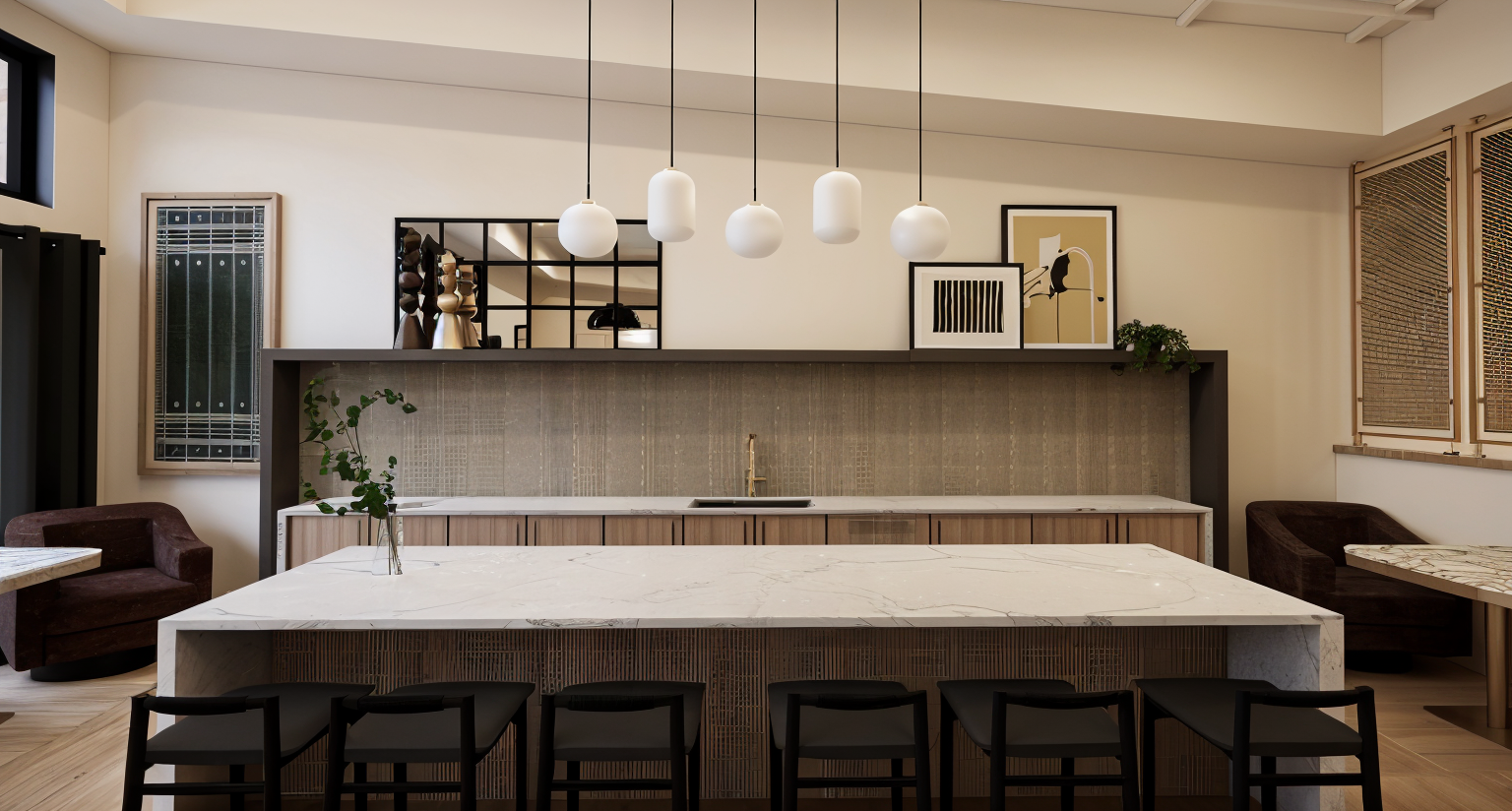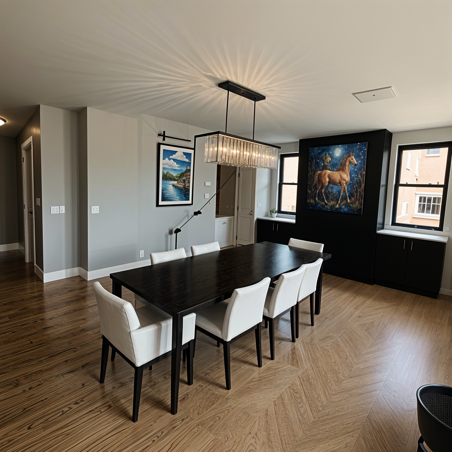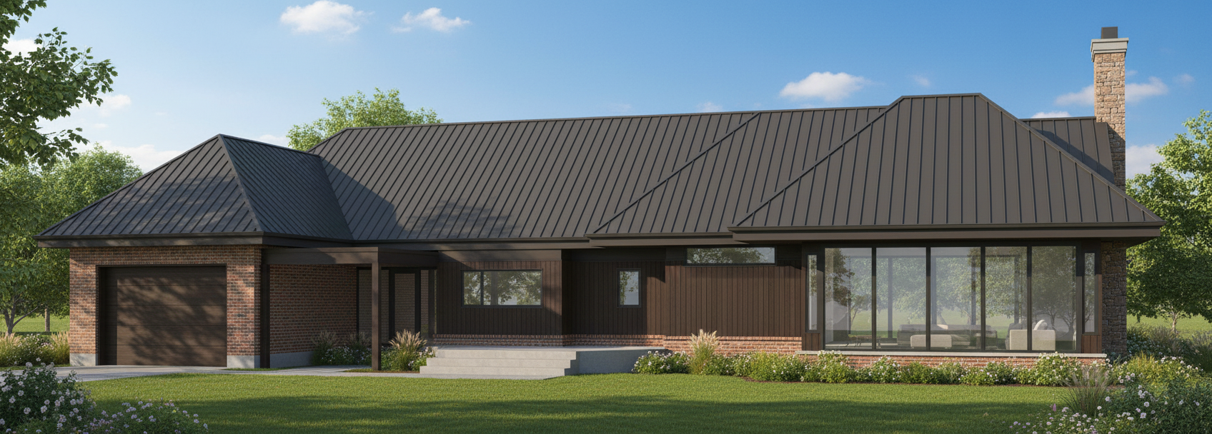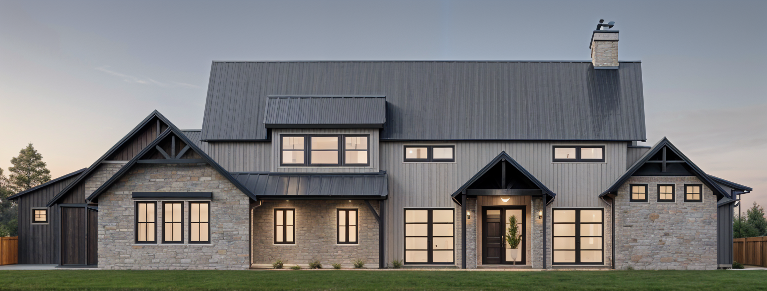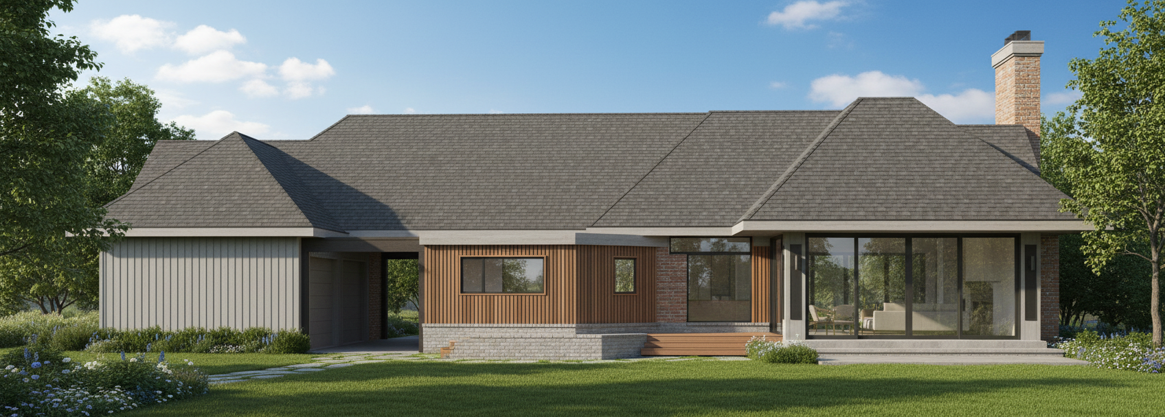 artistic grainy watercolor rendering of house with black and medium tone warm wood siding surrounded by oak tree forest and leafy forrest floor some branches in the foreground dense forest background asphalt driveway where indicated architecture