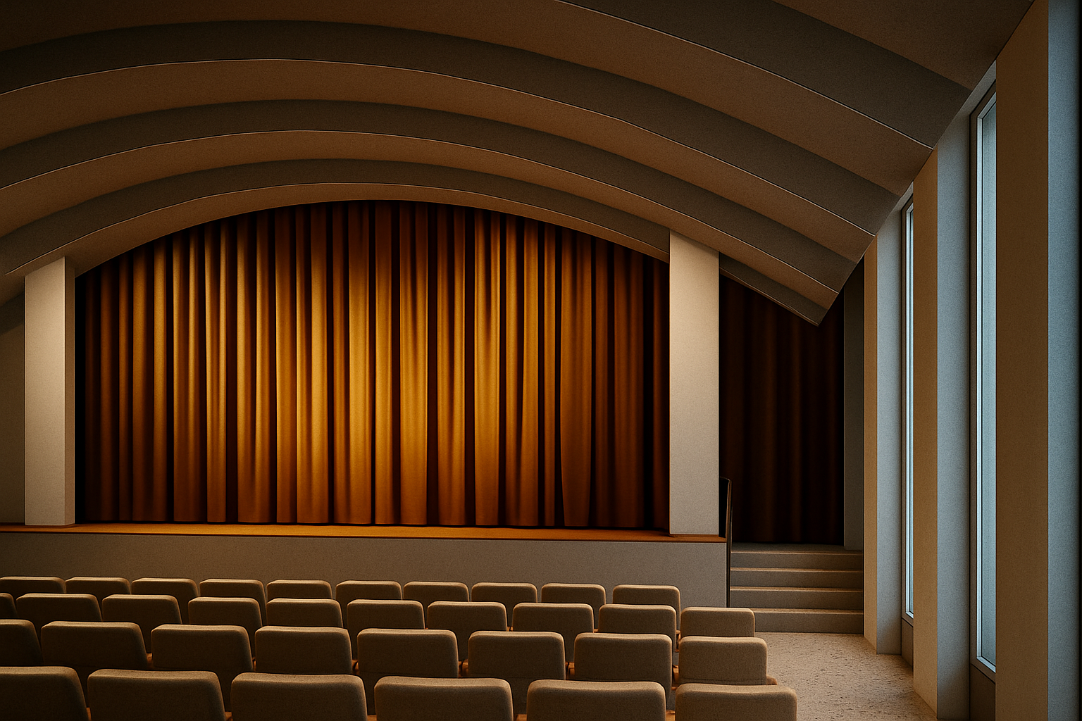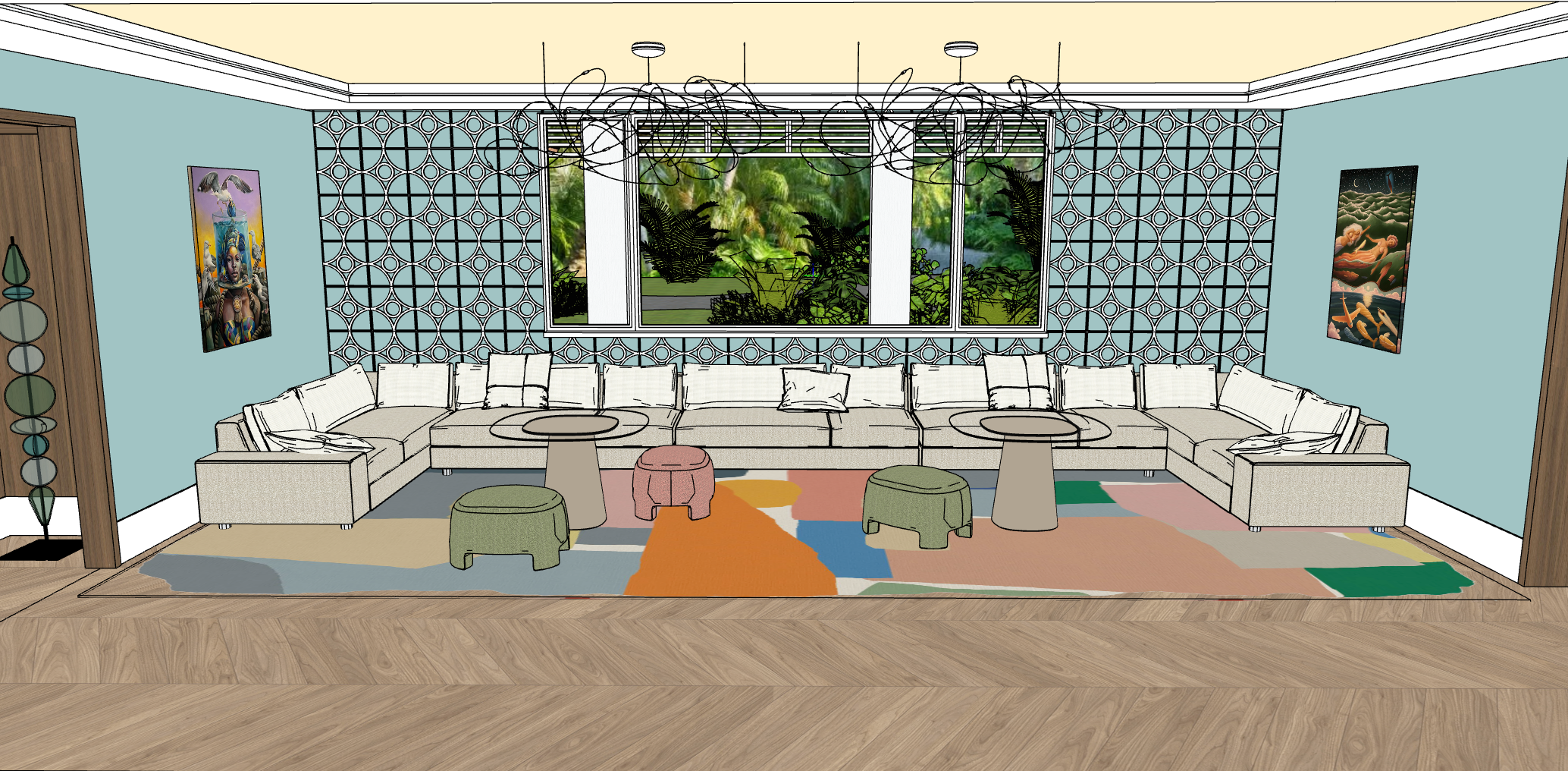 create a modern colorful living room with the sofa frame and seat cushions in cream taupe and the back and throw cushions in a lighter cream all with some soft subtle light shining to the ceiling from the coves and a natural bright light coming in from the window creating a soft natural shadow on the furniture with the exterior a fun tropical front yard and white tracery on the windows and an overall soft bright downlights coming from the ceiling to create an soft bright i atmosphere