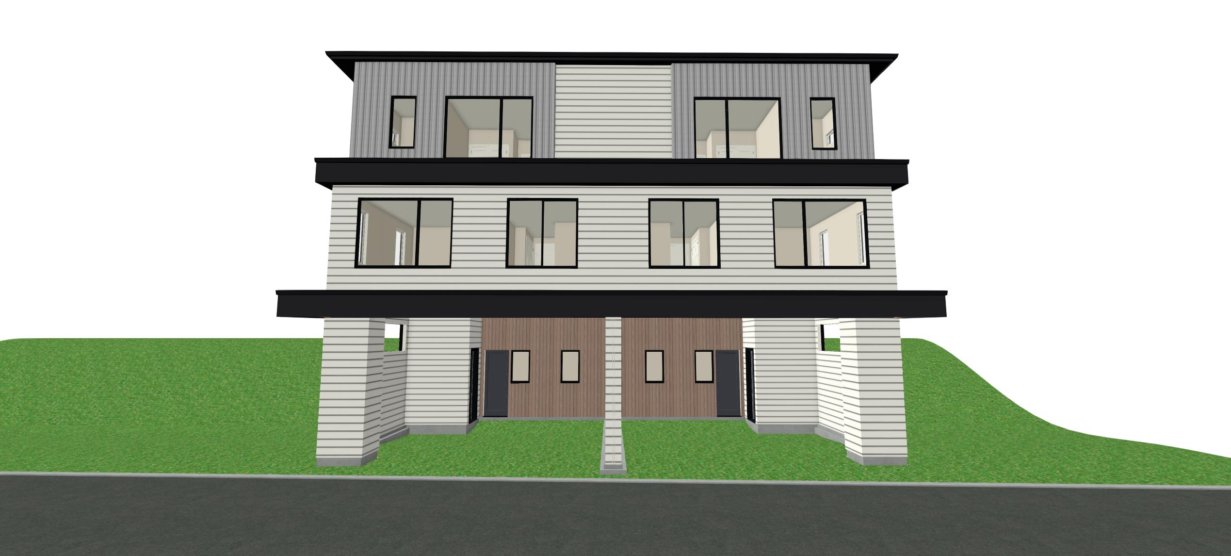 add concrete driveway landscaping and sunset in the background add more color contrast to the house materials