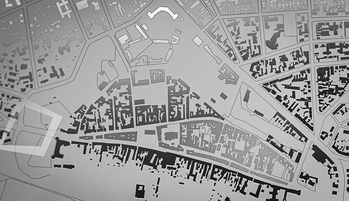 urban masterplan visualization style monochrome base subtle semi transparent terracotta overlays marking development zones thin analytical lines restrained graphic enhancement professional urban planning aesthetic swiss layout logic minimal color use