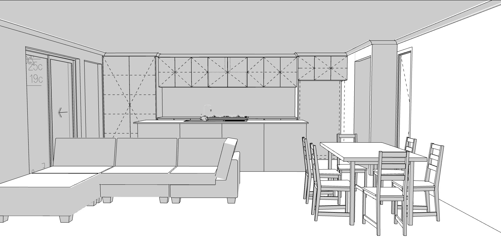modern render of kitchen living and dining room use light colours for kitchen cabinets