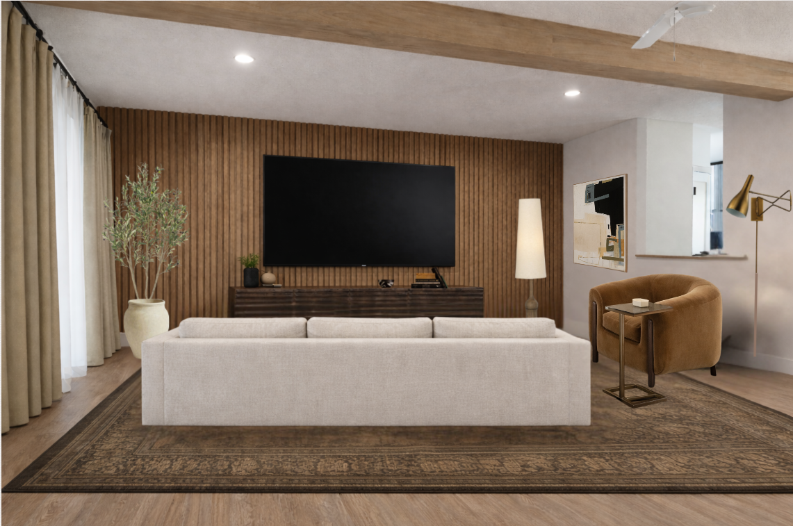 create a realistic 3d rendering add 2700k lighting and soft lighting behind tv