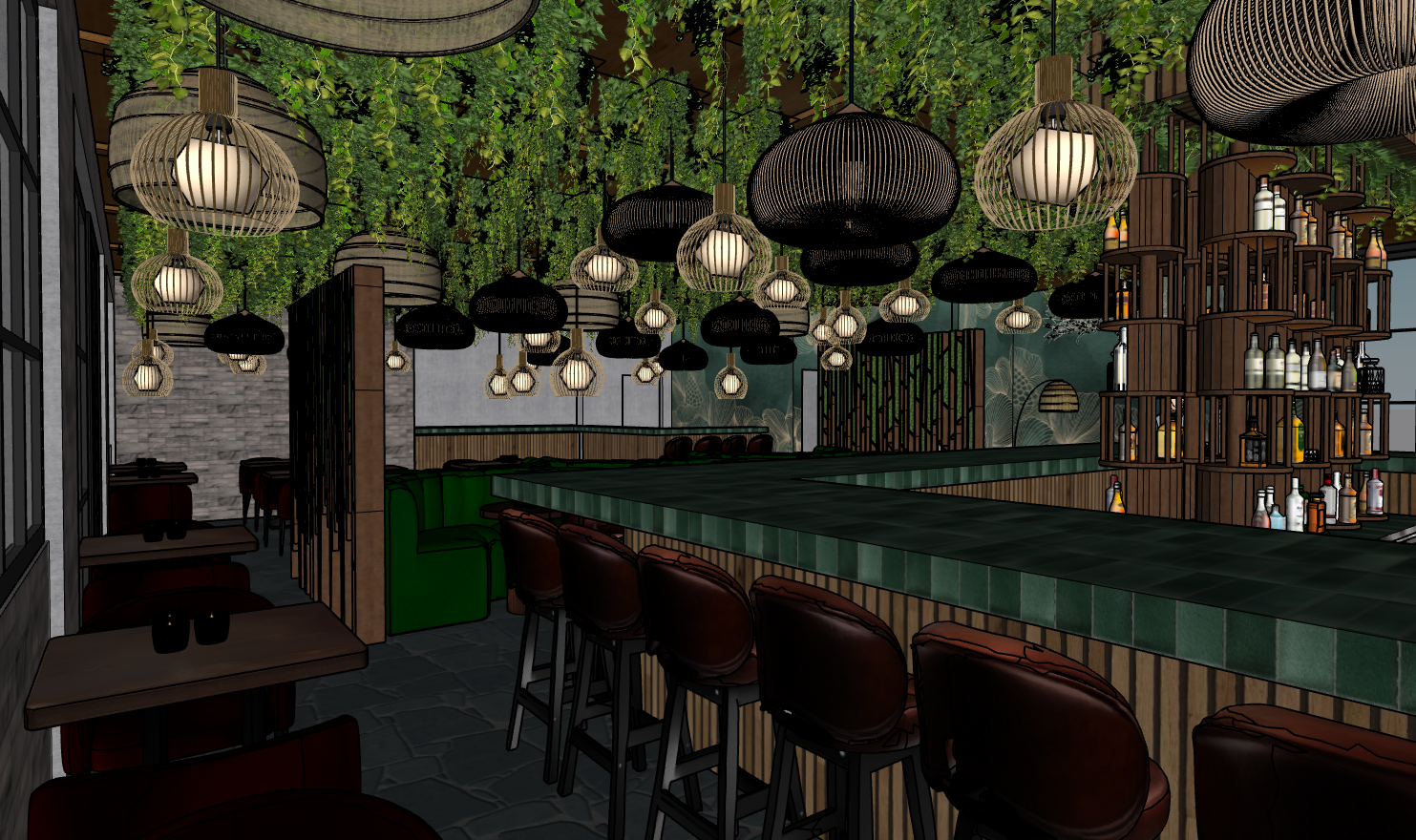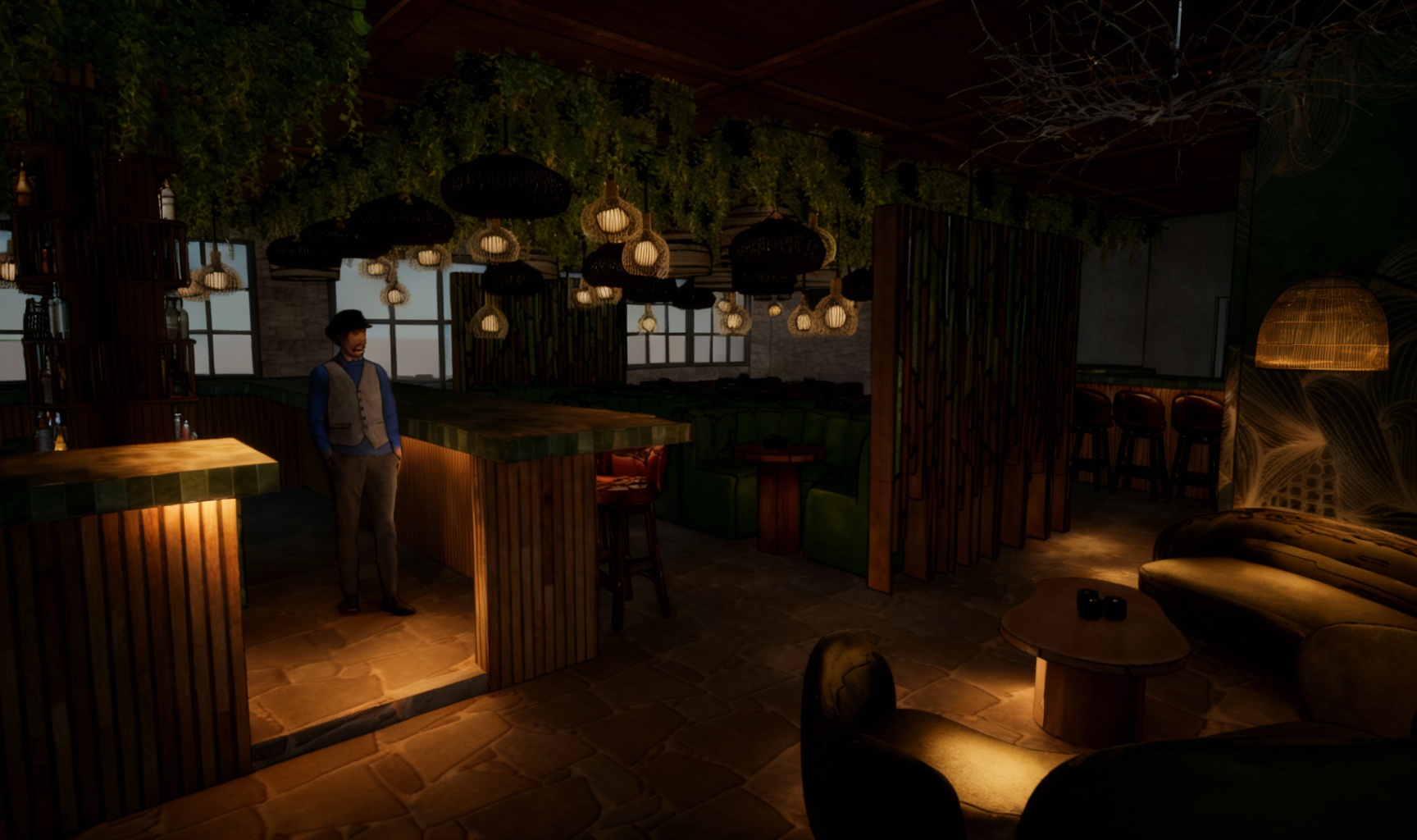 a moody realistic restaurant scene illuminated with dim warm lighting that enhances intimacy while keeping the space comfortably visible gentle highlights adding natural light from outside and from the ceiling lamps