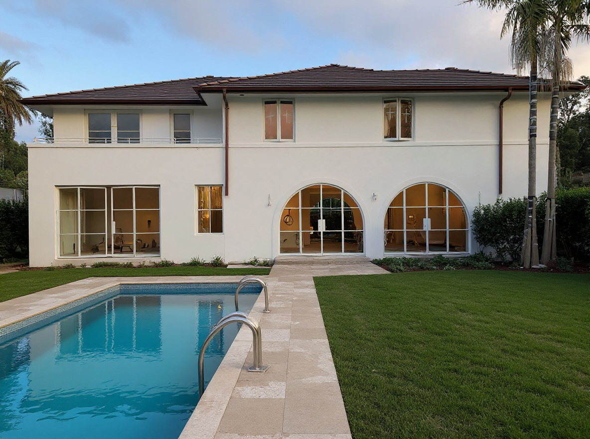 show this house that is under construction as a completed project with a flat lawn to the right of pool lush landscaping to the right and left of frame and limestone paving surrounding the pool and connecting the pool to the house for the full width of the pool remove the construction balustrade from beside the pool pool and landscape to have a california romantica and feel remove the tree protection from the palm trees on the right and the yellow protection to the tree on the left side of the building and extend the down pipes to the ground render to house to be warm white smooth above the datum line and with a pebble dash render texture below the datum line subtle hints of interior lighting