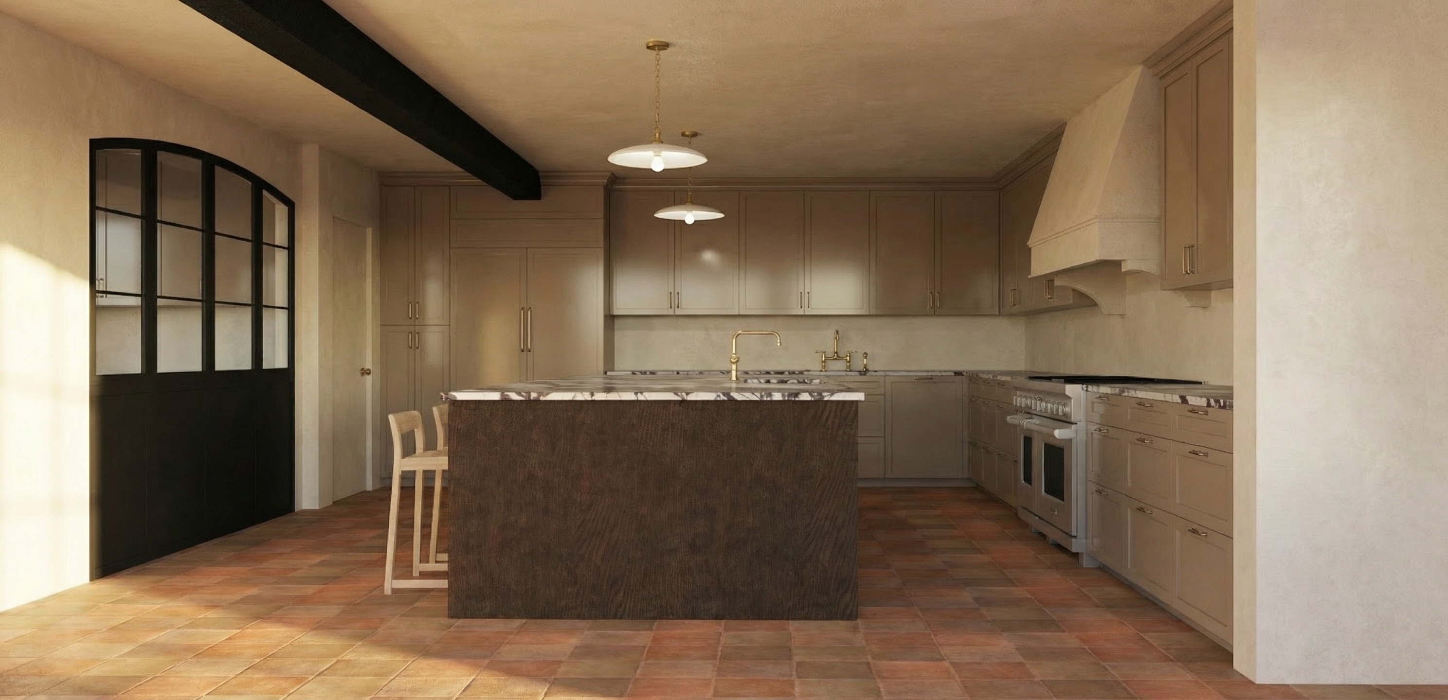 make the walls hood and ceiling a creamy white plaster but softer than shown here cabinetry to remain in the brown mushroom color as shown