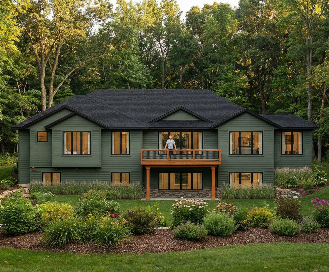 black shingles trim corners and windows wood stained deck and accents dark green siding nice landscaping summer day