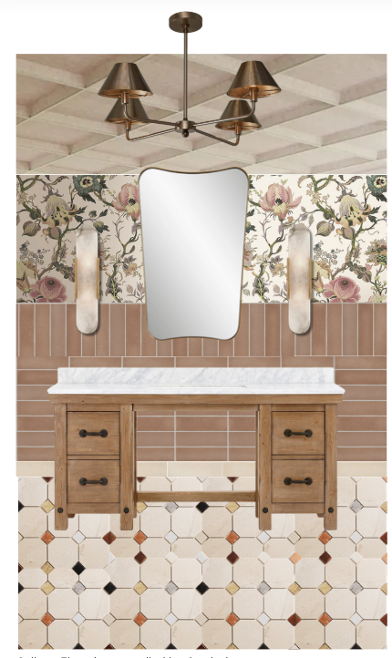 create a perspective drawing of the bathroom vanity and mirror in the style of the reference images the graphic outlines should be sketchy and scratchy maintain colors
