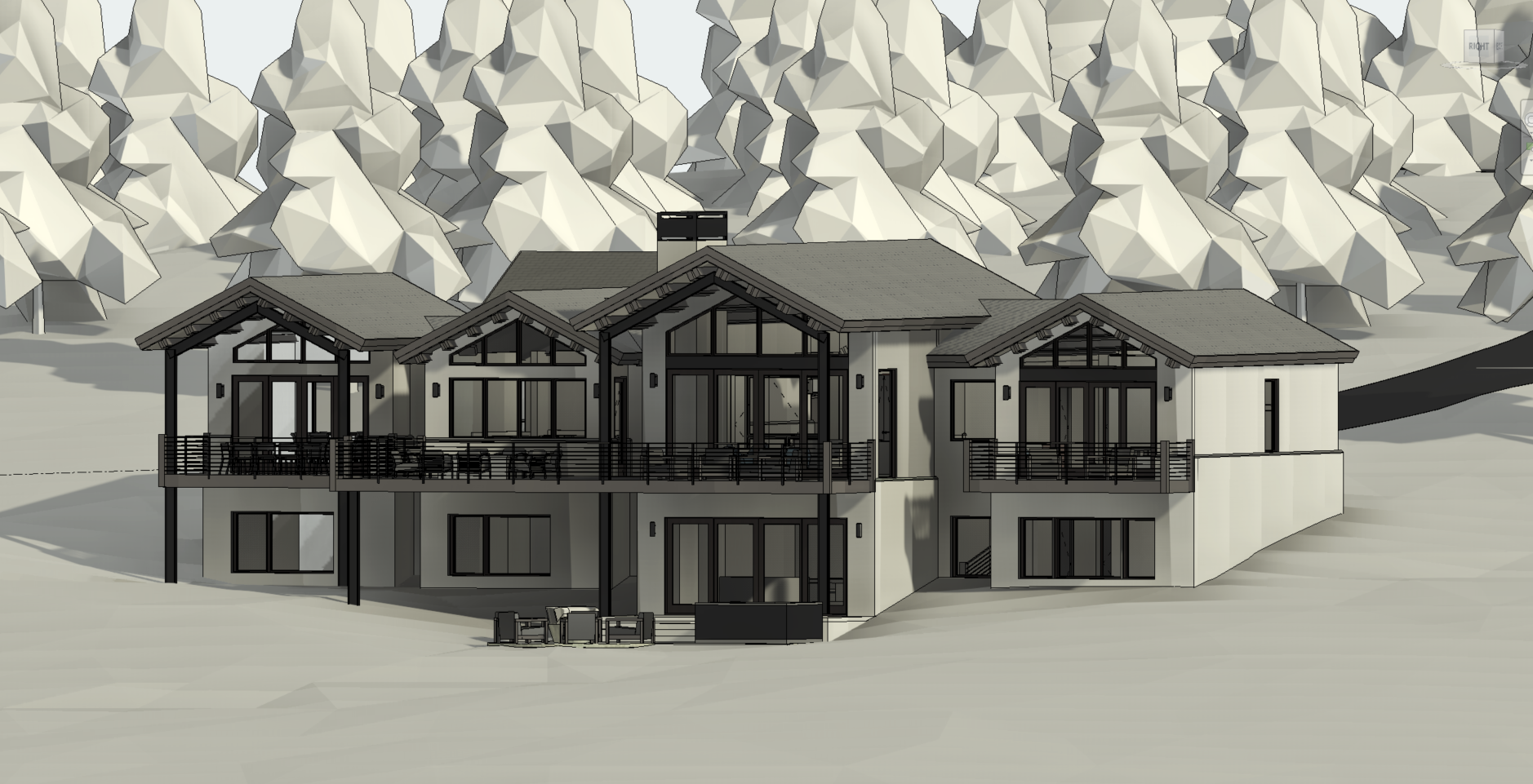 exterior shot traditional snowy pine forest uphill dark wood exterior stone base pine forest wood siding architecture