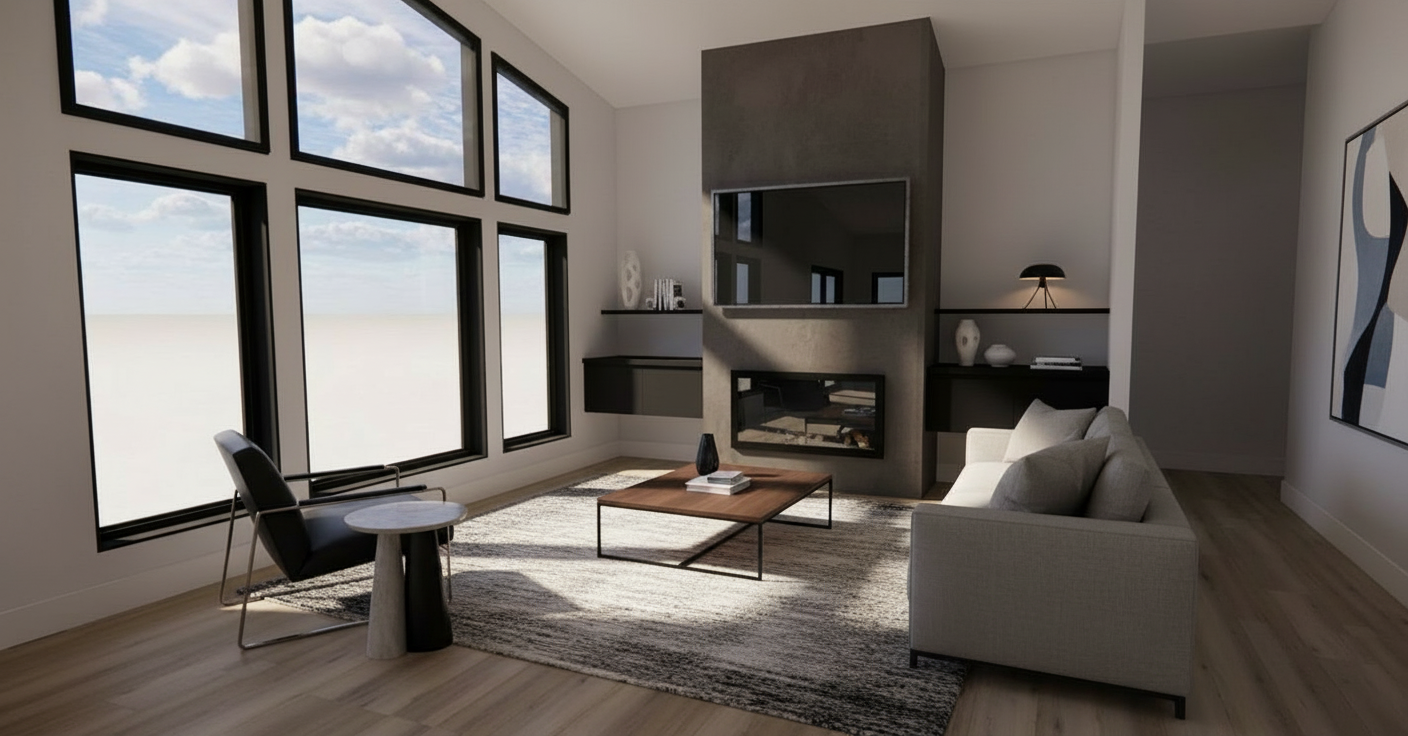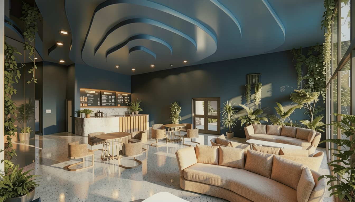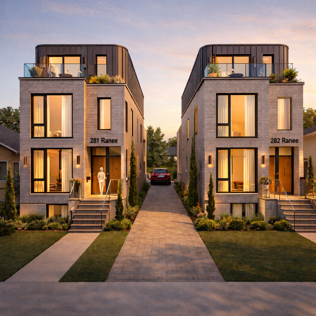 make it more photorealistic and add some people living in the buildings evening scene flip the building on the left horizontally