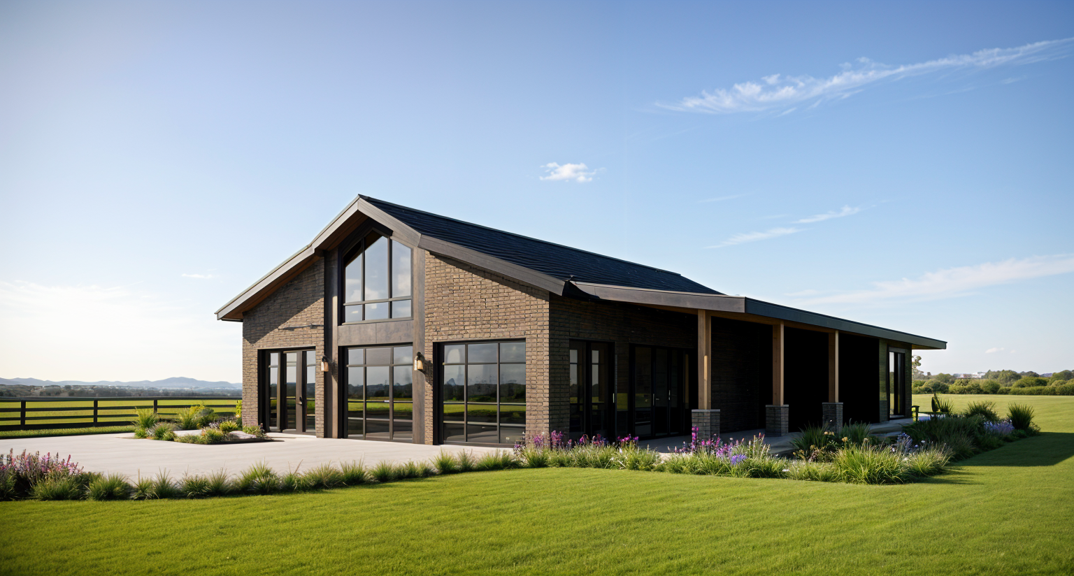 modernist exterior shot rustic modern house with sleek dark steel siding and a contrasting silver metal roof elegant wooden columns and stone pillars add character to the front porch large warm yellow windows glow invitingly bright clear sky above casting soft natural light over the serene scene architecture