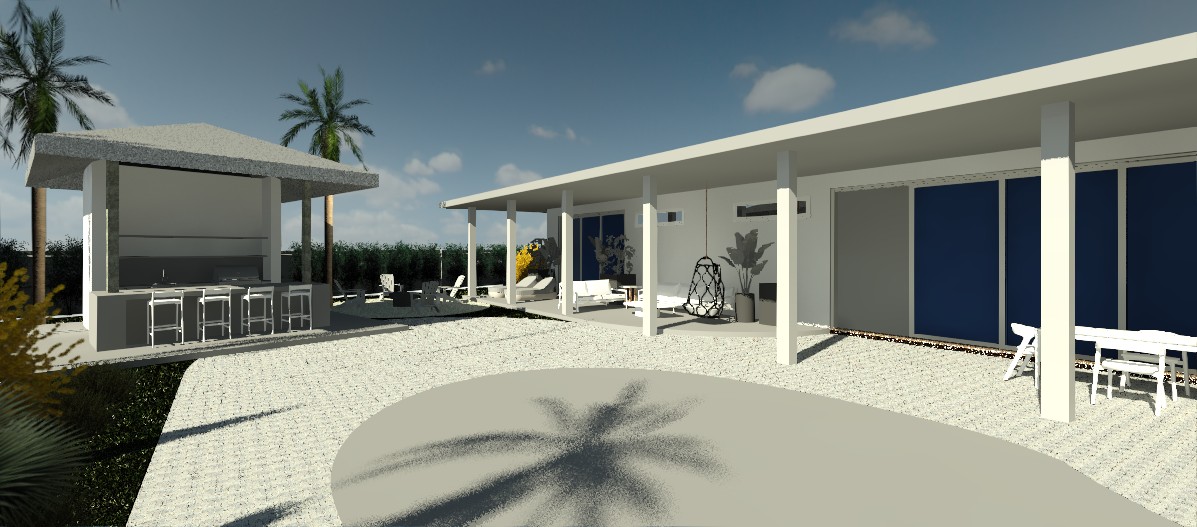design a contemporary florida beach style residential home with a relaxed coastal aesthetic the architecture should feature light gray smooth stucco exterior walls and a standing seam metal roof in a soft silver or light galvanized finish emphasize deep overhangs for shade and a seamless indoor outdoor connection enhance the dedicated outdoor social space as a central design feature a covered lanai designed for gathering and entertaining include a built in outdoor kitchen with grill and prep counter comfortable lounge seating and a dining area positioned to encourage conversation consider a wood paneled or tongue and groove ceiling under the covered area integrated ceiling fans and recessed lighting the space should feel like an extension of the interior living room incorporate white exterior doors with semi translucent frosted or sandblasted glazing panels to allow diffused natural light while maintaining privacy windows should be large impact rated and framed in white or light aluminum surround the home with lush tropical vegetation native to south florida coconut palms sea grapes bird of paradise and layered coastal plantings the landscape should feel natural yet intentional with shell or light stone pathways subtle exterior lighting and the pool should be darker blue tile in color the setting should feel airy warm and sunlit capturing the coastal florida lifestyle with soft shadows ocean breeze atmosphere and bright sky conditions use natural textures and a neutral palette with subtle contrast between roof stucco and trim style coastal contemporary mood relaxed social tropical modern lighting bright midday florida sun with soft shadow play