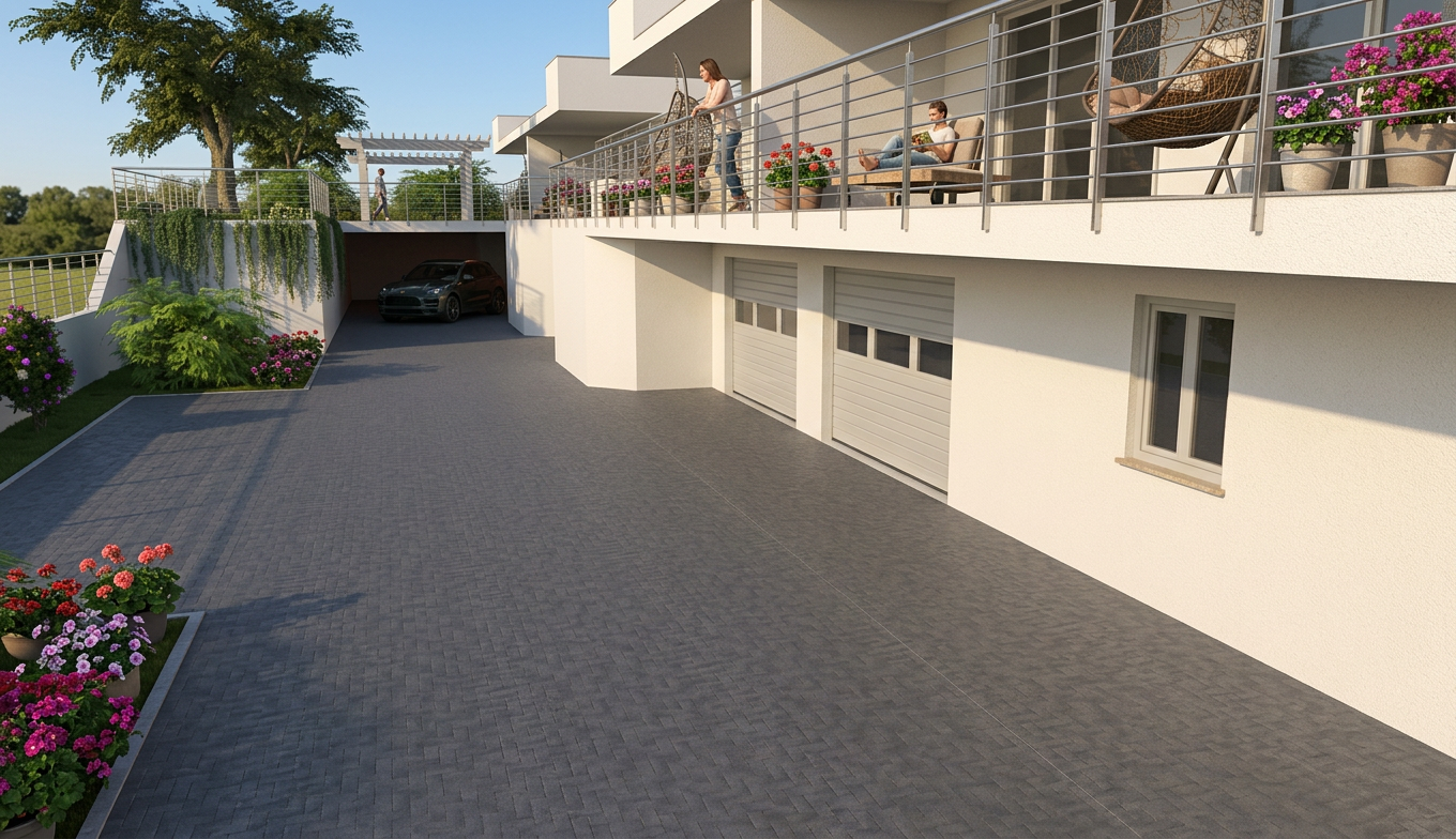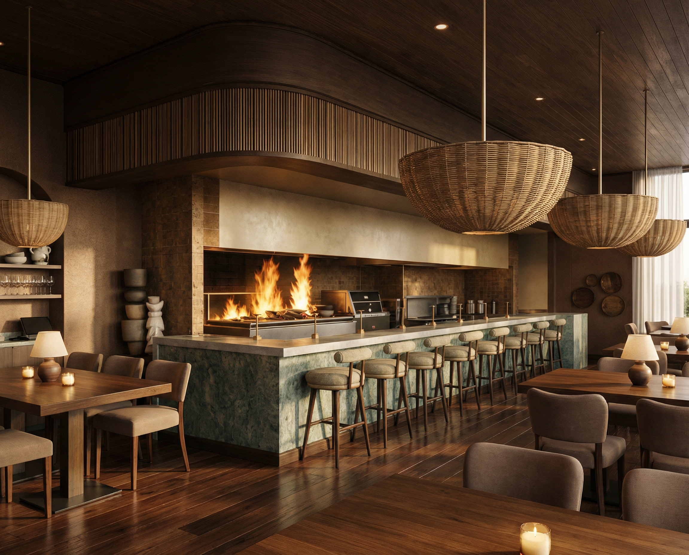 render a beautifully detailed floor plan of a modern home the kitchen area features sleek stainless steel appliances and rich walnut cabinetry accented by a warm golden pendant light the living area is cozy and inviting with a plush cream colored sectional sofa and a rustic oak coffee table atop an intricate persian style rug the pool table area is highlighted with deep green felt on the table creating a vibrant and lively atmosphere surrounded by soft ivory walls in the bedrooms imagine soft blue tones on the walls with white minimalist furniture that offers a serene and clean look add leafy potted plants for a touch of nature the entire scene is illuminated with soft ambient lighting creating a warm and welcoming atmosphere