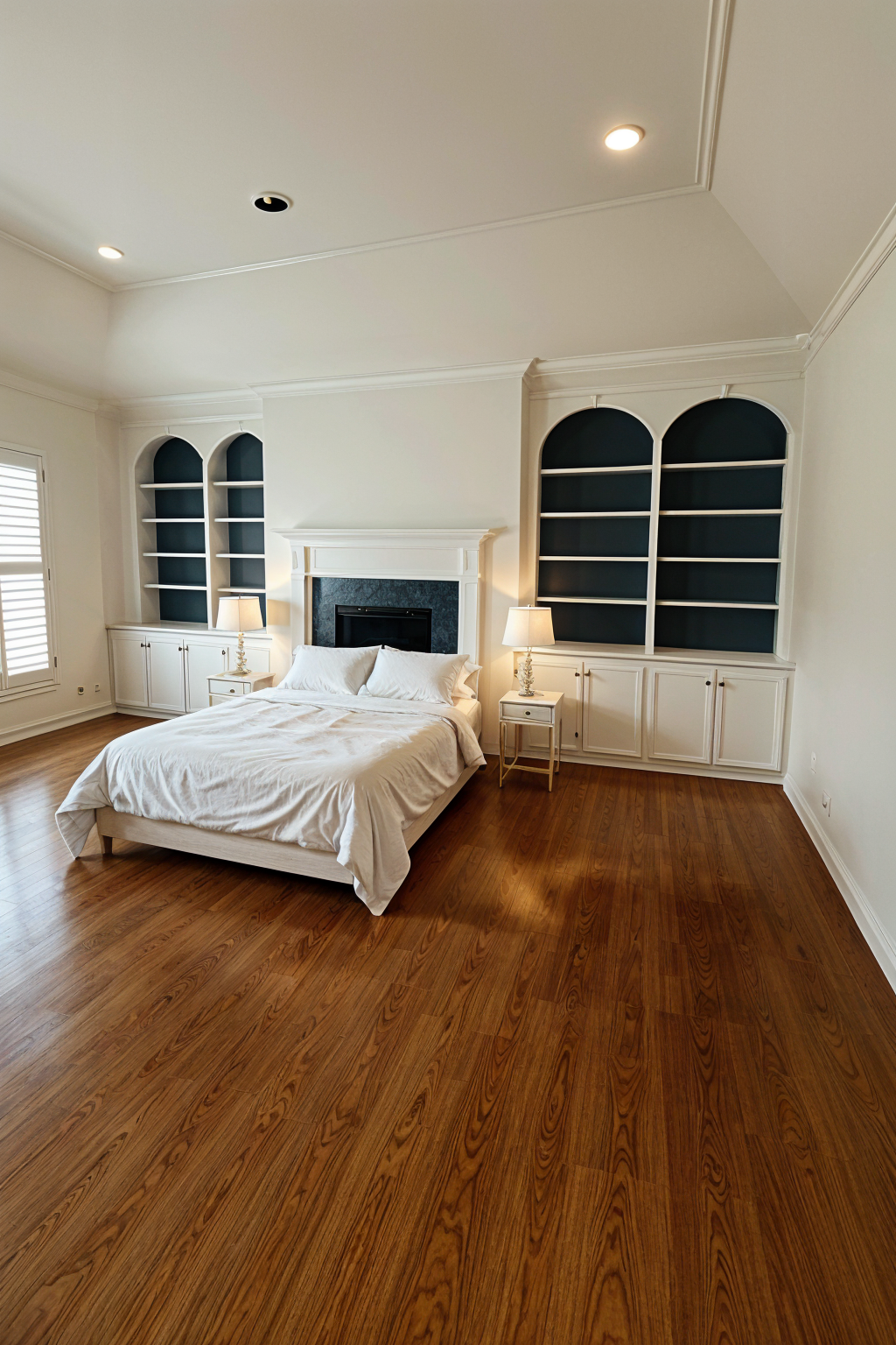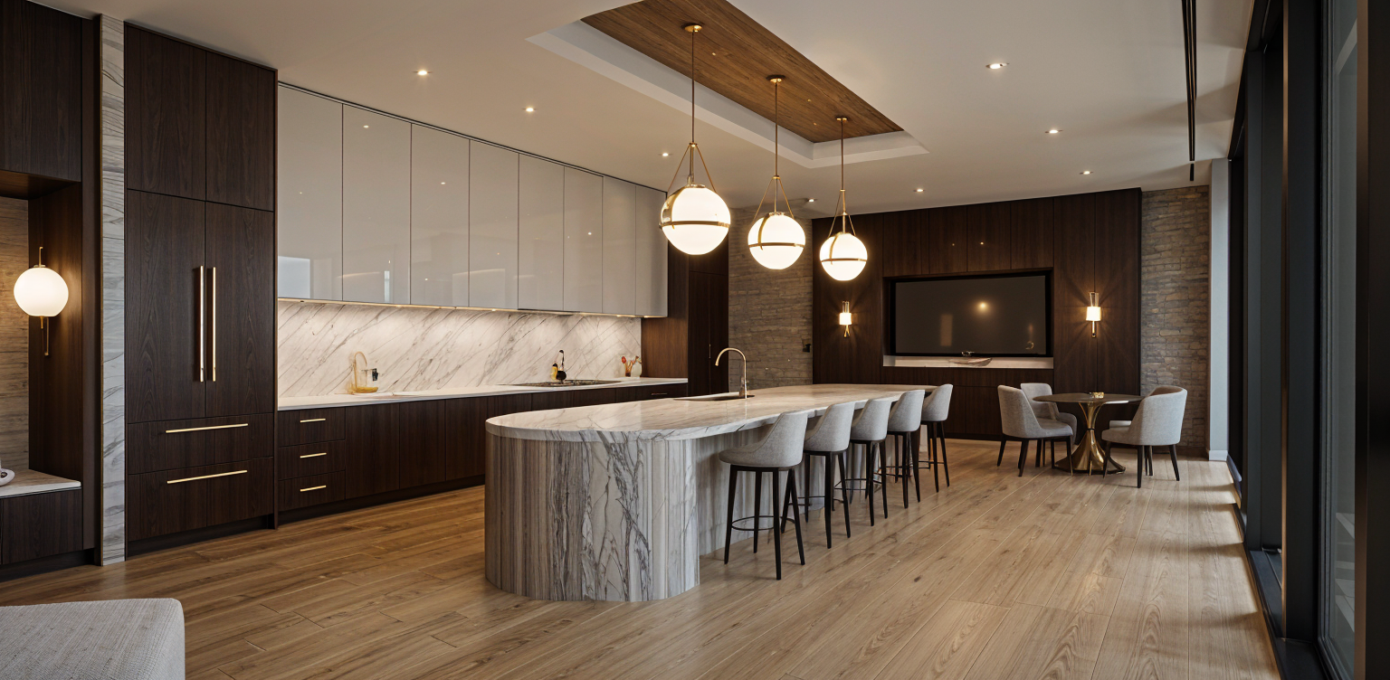 can you make the curve in the island slatted with marble texture and the tray ceiling above larger