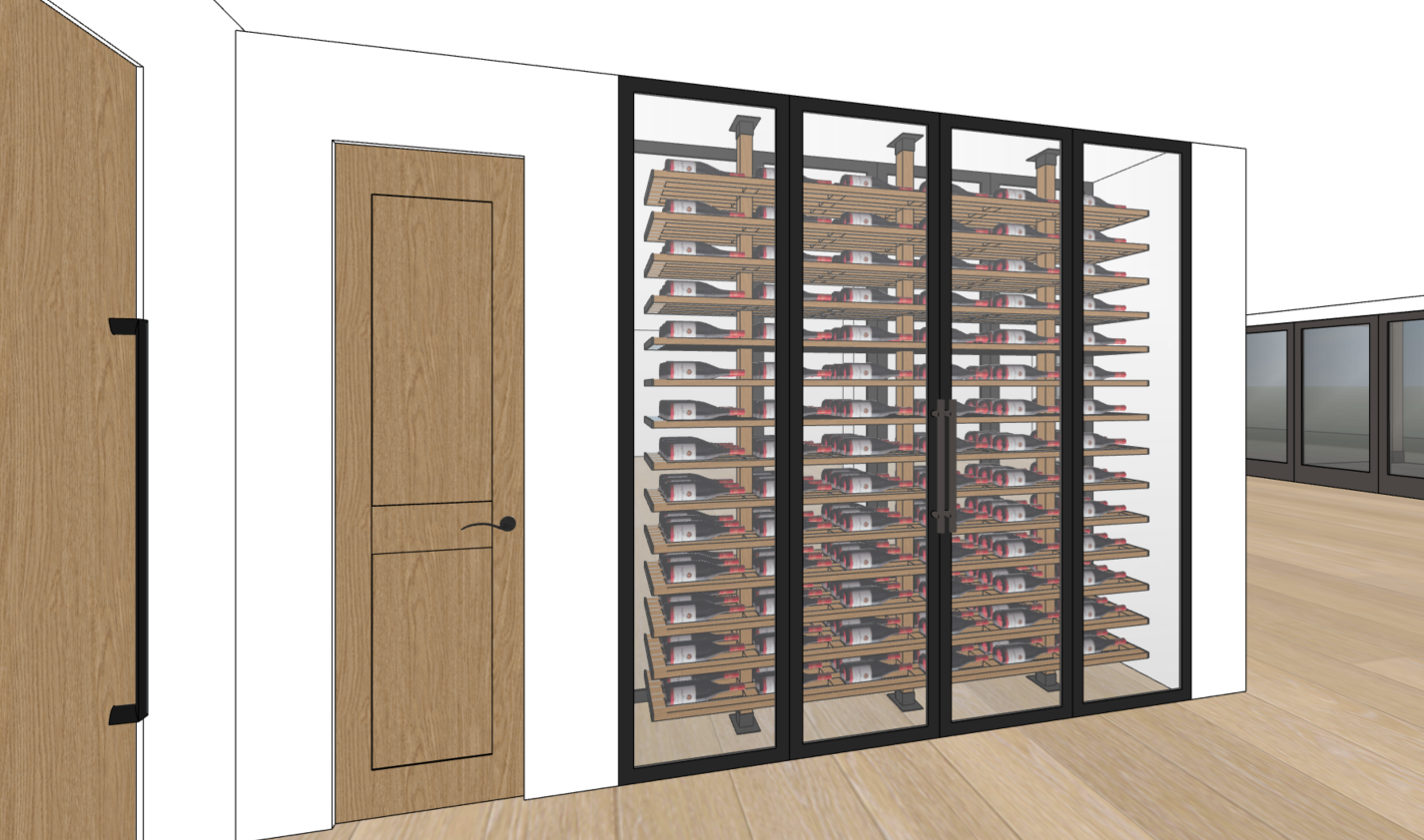 a modern wine cellar featuring a sleek glass enclosure with black frames showcasing well organized wine bottles on teak wooden rails there are four black framed glass panels with two long black metal handles side by side in the middle flanked by stationary glass panels on either side of the doors the floor is a medium toned hardwood enhancing the rustic elegance bright clean white walls contrast with the darker elements creating a sophisticated yet inviting atmosphere the overall mood is refined and contemporary with a focus on the stylish display of the wine collection mountain landscape outside the windows