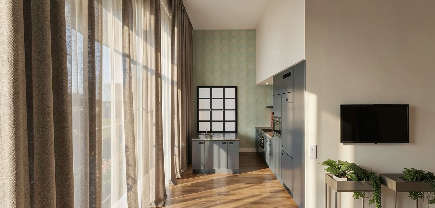 white line curtains oak floor morning light