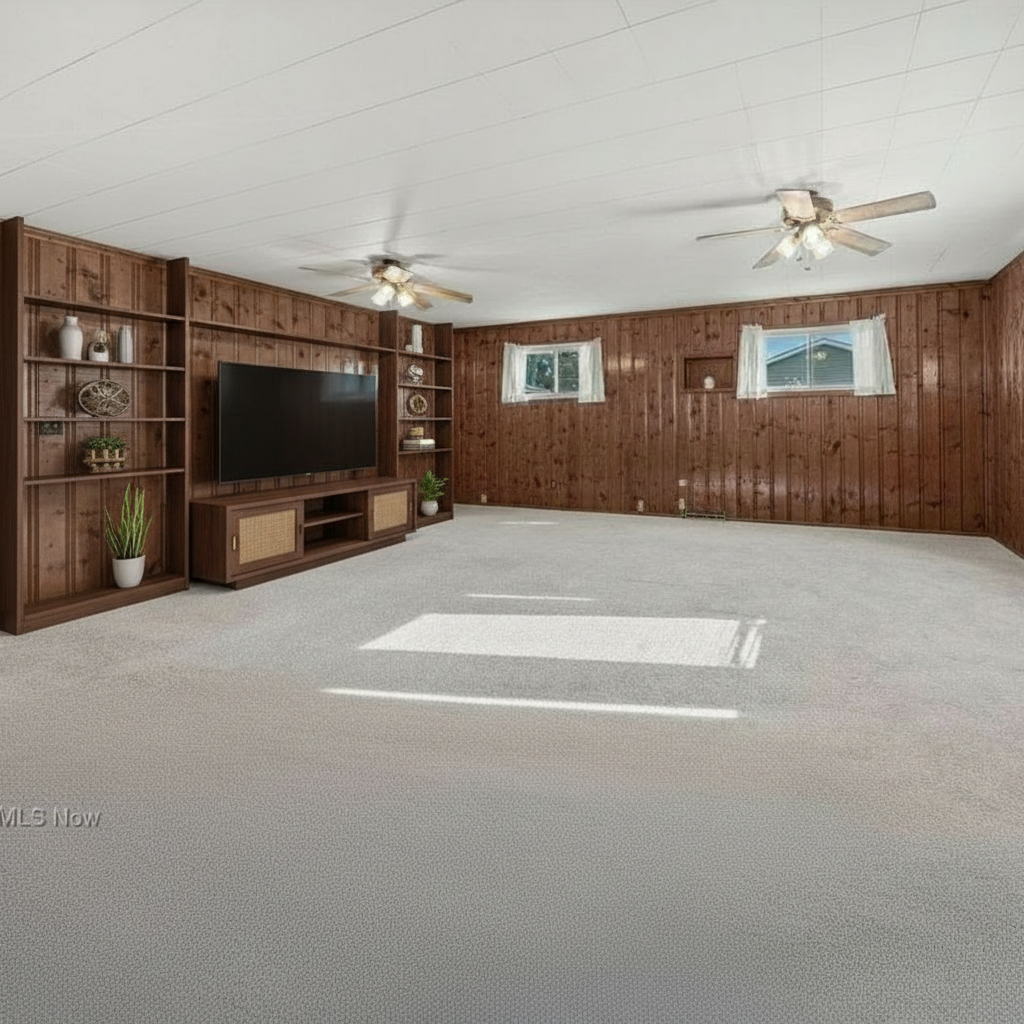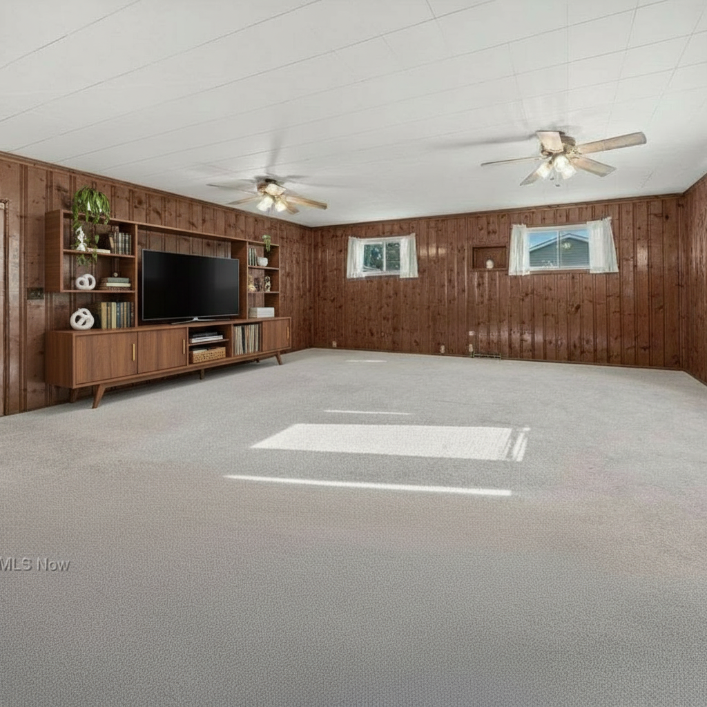 remove the ceiling fans furnish this room with midcentury style furniture use a lime green turquoise and gold color scheme