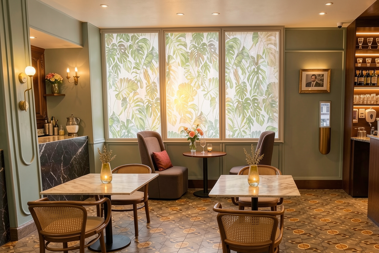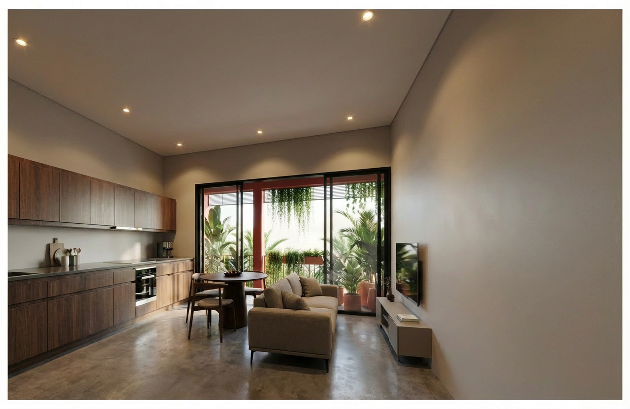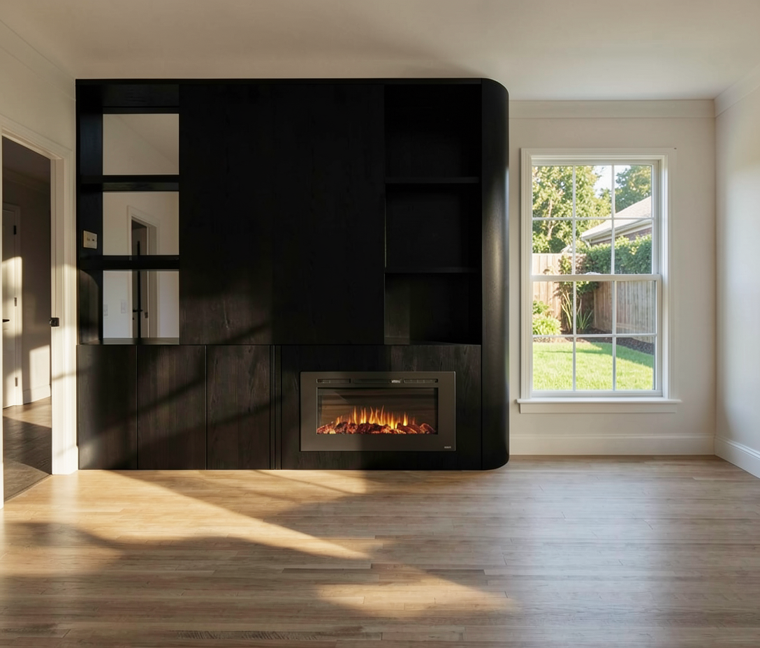 make the wood painted black and outside the window add a front yard and neighborhood street in the background the left side of the cabinet is a mirrored backing on the very left is a door opening with shadows leading into a hallway lighten the image so we can see the elements