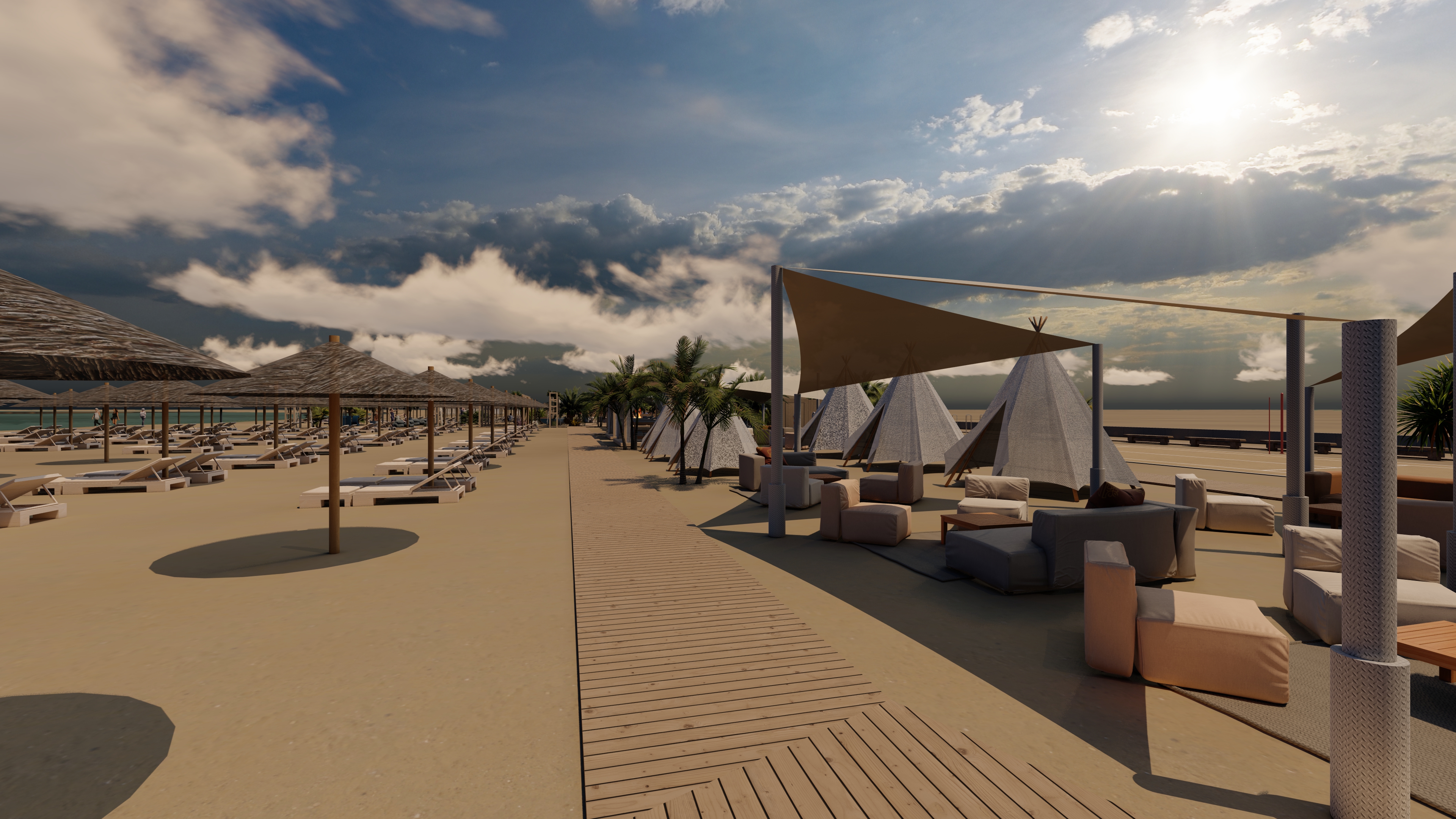 add realistic textures and lighting realistic sand texture on the right side add a background of a beach promenade with hotels