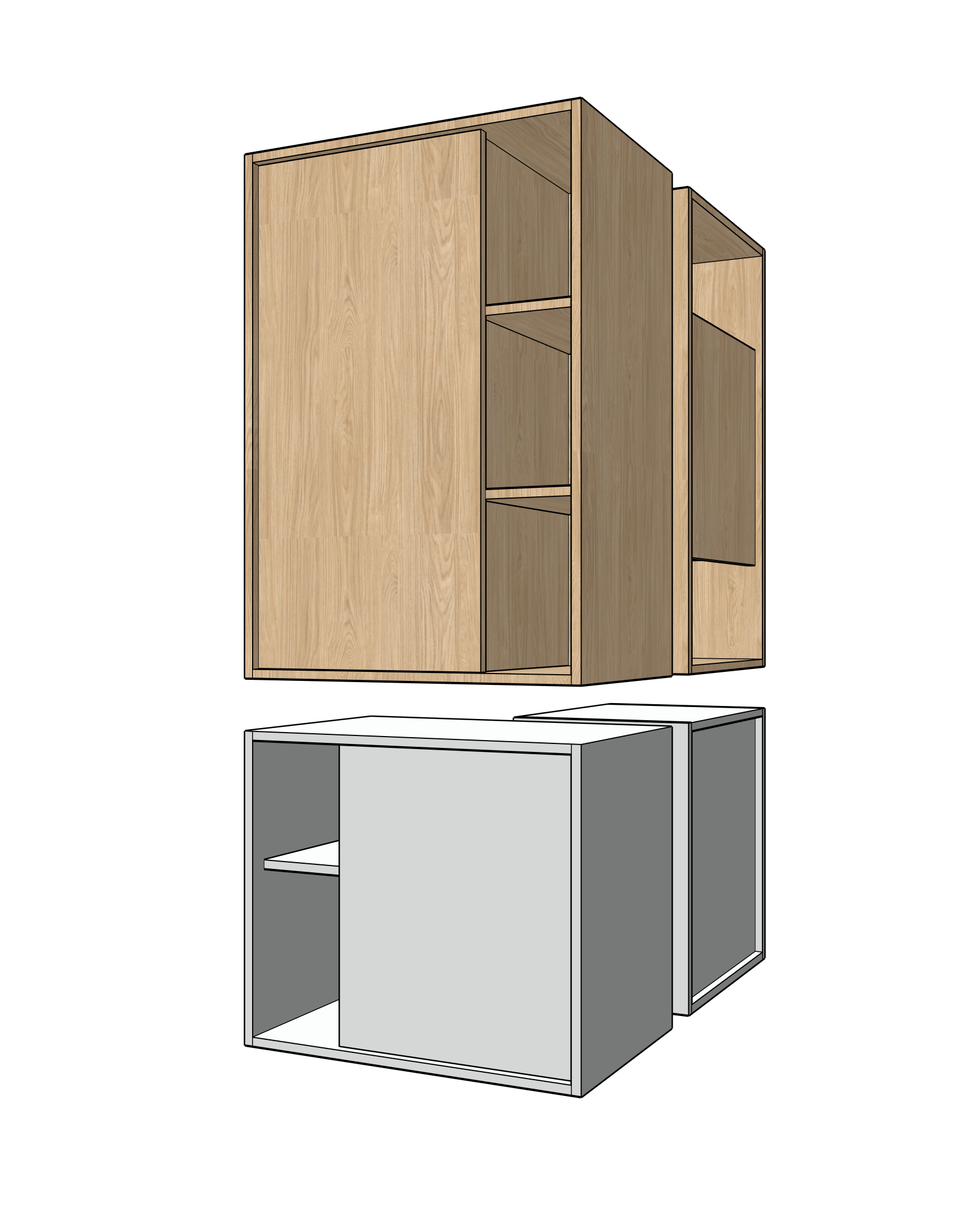 modern furniture in light greybeige and light oak matt finish white background no decorations no handles