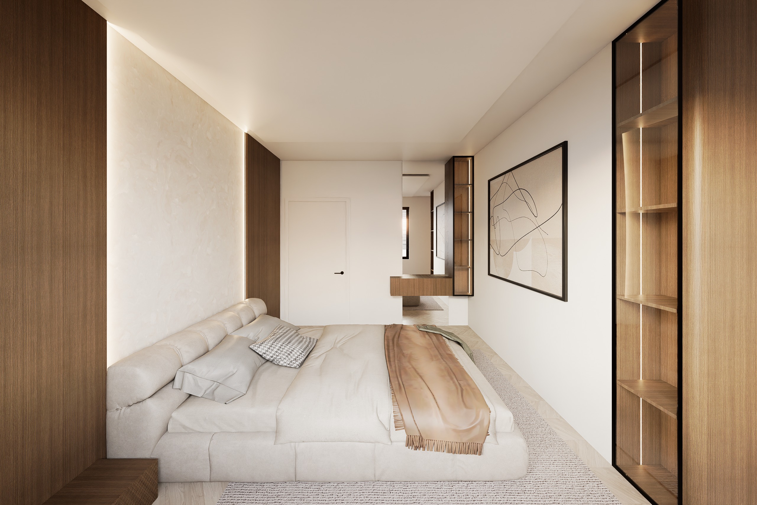 ultra realistic architectural render of a modern minimalist bedroom from a side perspective preserve the exact layout proportions camera angle and composition from the reference image color palette soft warm beige tones combined with dark warm walnut wood vertical grain rich natural variation matte satin finish bed large upholstered bed in soft beige fabric maintain exact design and proportions realistic fabric texture with subtle folds and weight layered bedding in neutral tones beige taupe warm brown throw headboard wall left side full height walnut wood panel vertical grain not horizontal center light textured plaster stone wall integrated vertical led light strips between materials soft warm glow diffused premium look left side integrated low nightstand in walnut seamless and minimal right side tall glass display cabinet with dark frame interior shelves in wood with vertical integrated led lighting warm lighting premium showcase feel back wall depth minimal white wall with flush door and black handle floating vanity console in walnut with mirror above keep clean aligned no clutter decor large framed minimalist artwork on right wall neutral tones soft abstract composition floor light herringbone wood flooring soft textured rug under bed lighting warm indirect led from headboard wall and display cabinet soft natural daylight from window off frame balanced exposure no harsh contrast realistic shadow falloff materials physically accurate textures wood grain fabric plaster no plastic look no excessive gloss subtle imperfections for realism mood calm warm high end residential boutique hotel feel rendering style ultra photorealistic interior editorial quality soft shadows high dynamic range do not change layout or design only enhance realism lighting and material depth