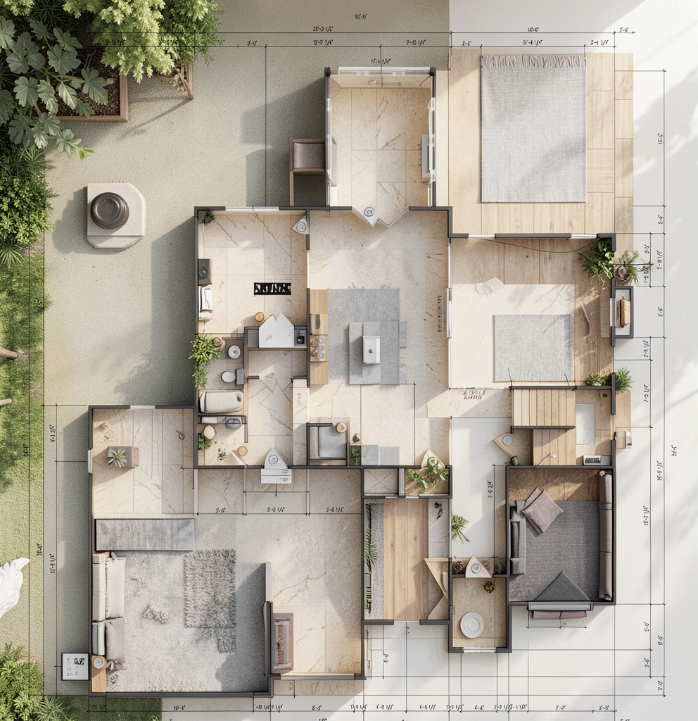 render a modern interior reception desk scene with a honed taj mahal stone counter in a soft gray complemented by a textured bronze front panel and rift white oak side panel with horizontal grain use a sleek dark frame for the window with a lush golf course visible add a natural flagstone wall on one side in varying shades of gray for a rustic touch create a tranquil and inviting atmosphere with diffused natural light gently illuminating the space