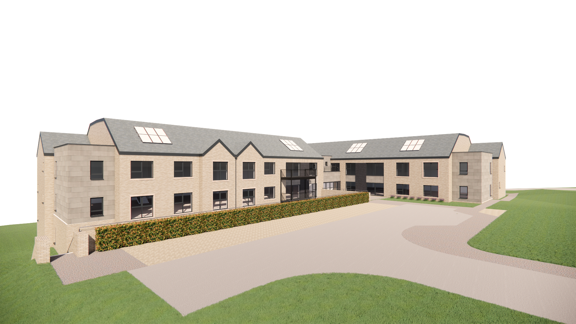 make this render realisitc and enhance it add sky with few clouds slightly warm sun add some soft planting on grass areas make grass realistic add trees to background keep materials the same cream buff common brick where shown dark grey horizontal standing seam zinc cladding where shown solider cream buff common brick where shown above some window heads cream sandstone widow cills and surrounds where shown grey modern slate roof tiles dark grey bricks where shown solar panels are shown on roof