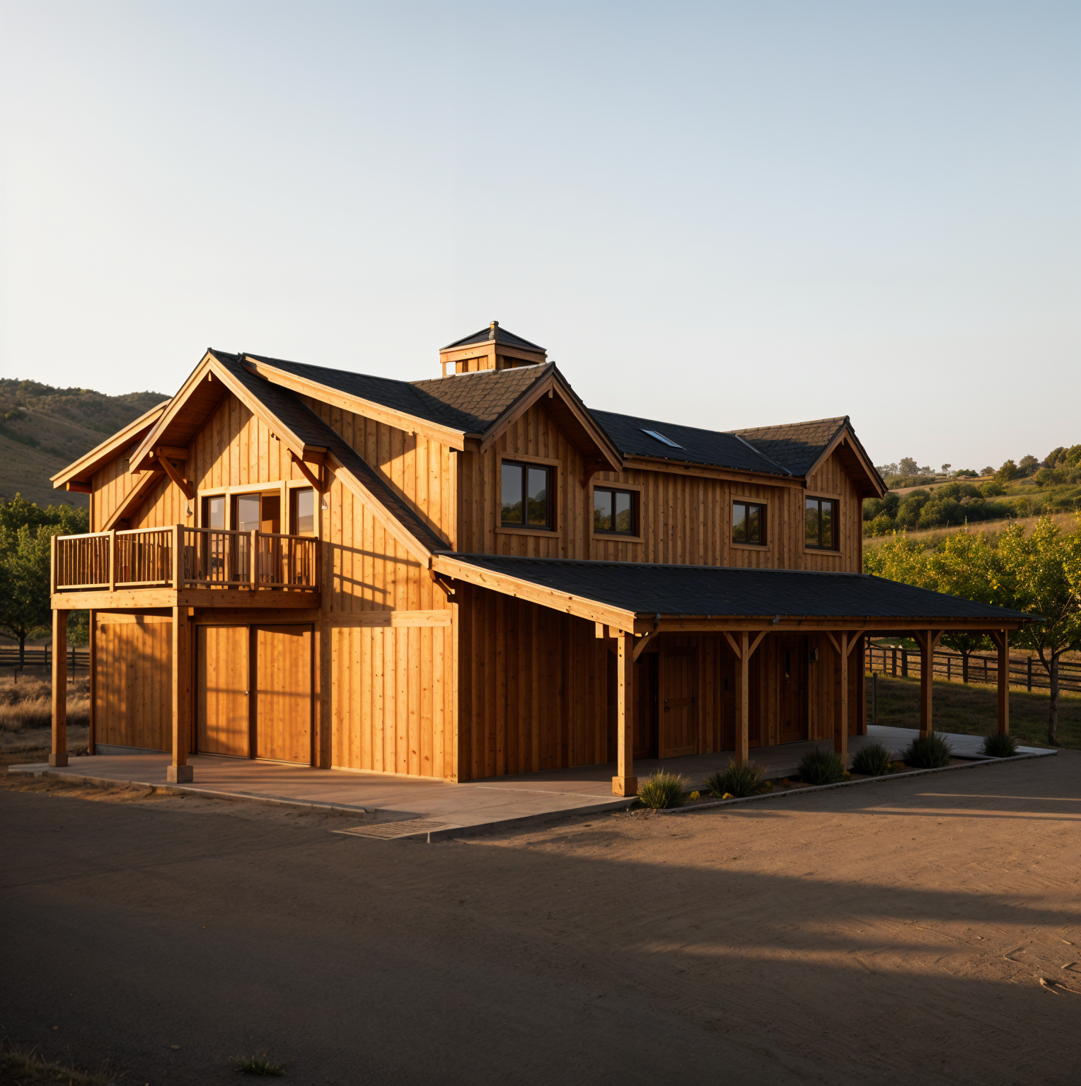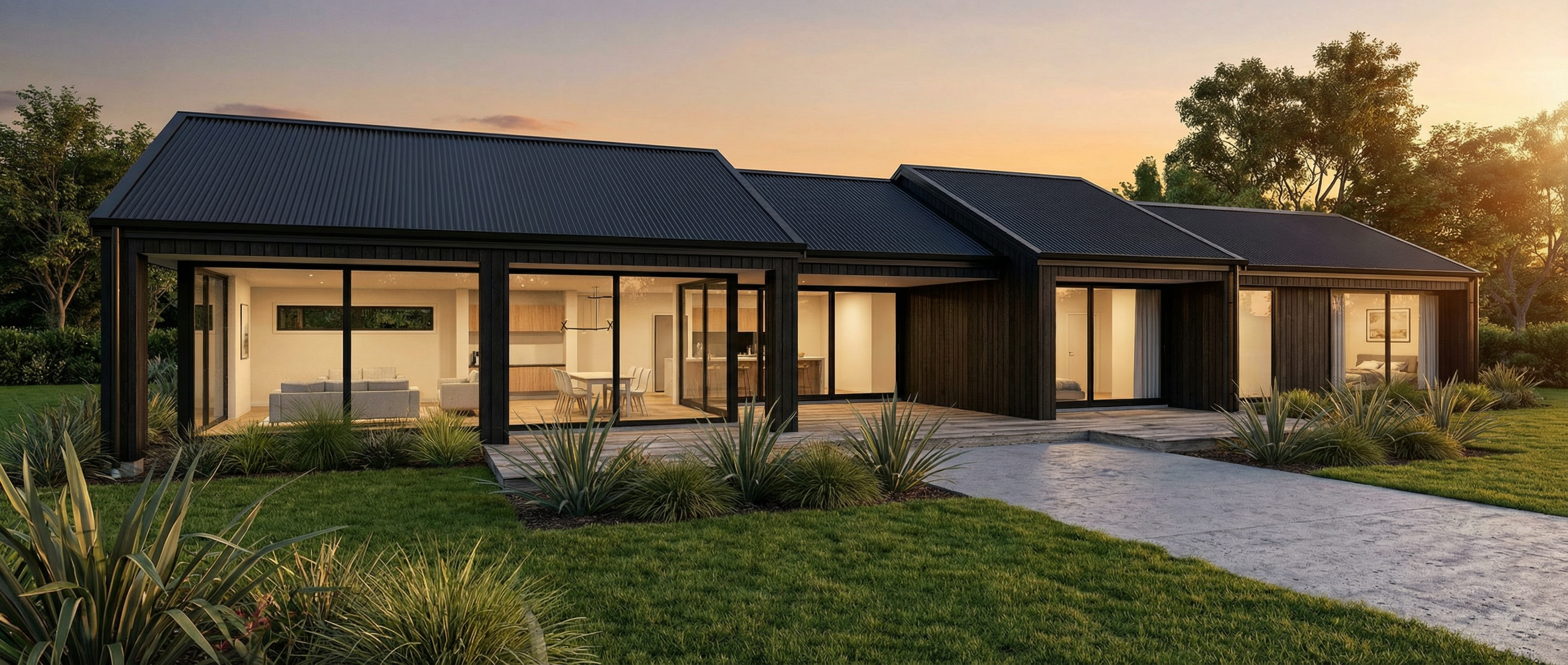 black roof vertical black timber cladding black window frames low timber deck lawns extensive native planting background trees sunset interior lights on
