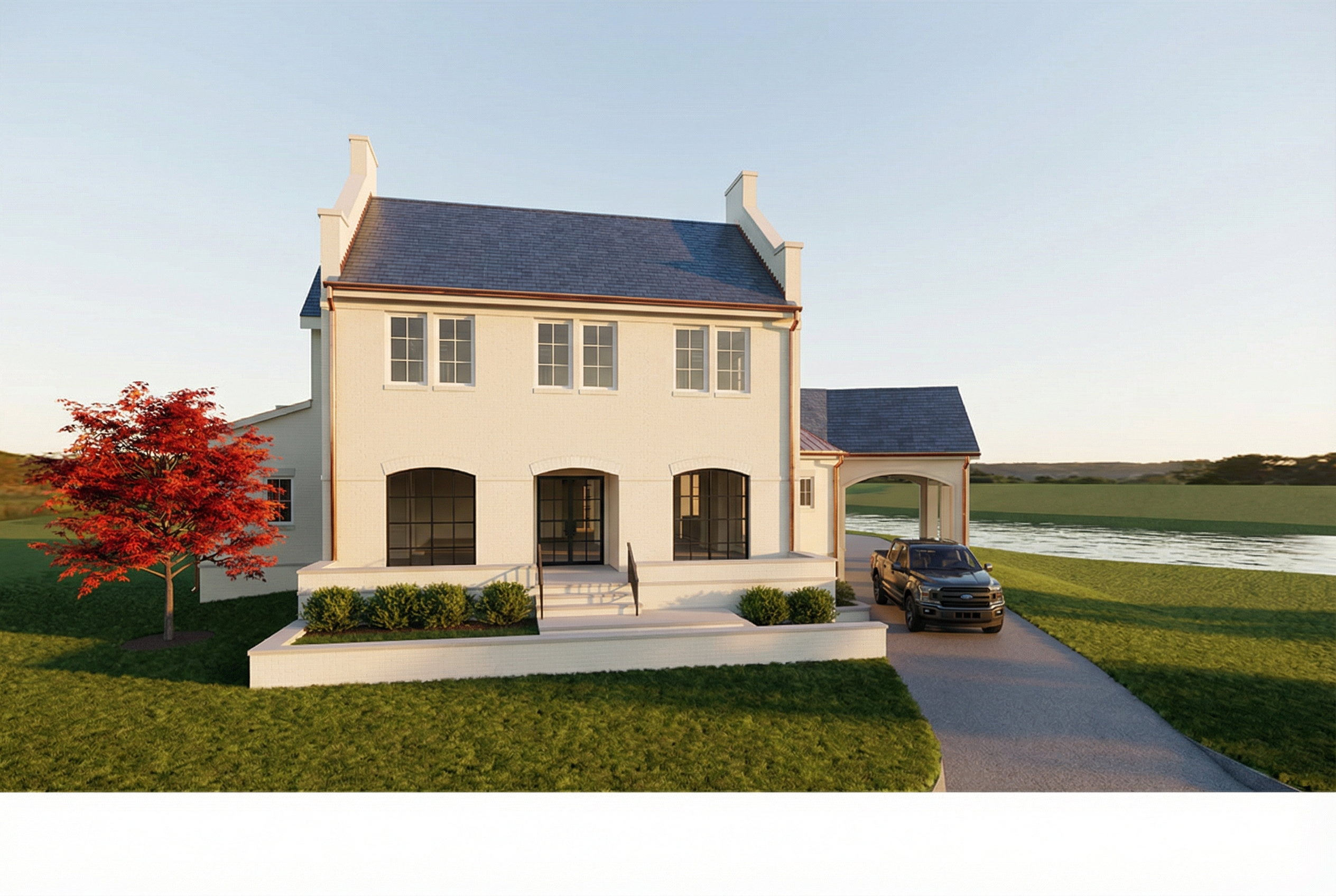 black framed windows contemporary style stucco with modern accents add some mature trees in the background add a walkway to the steps add a driveway to the garage door give the building a modern limestone look add some ornaments add more limestone detail to the building make it early afternoon with a nice sky only make the windows rail door garage and light fixtures look black keep the building and the roof caps a light color make the roof caps to match the building color also add an ultra modern flat water feature centered on the front lawn on the right side
